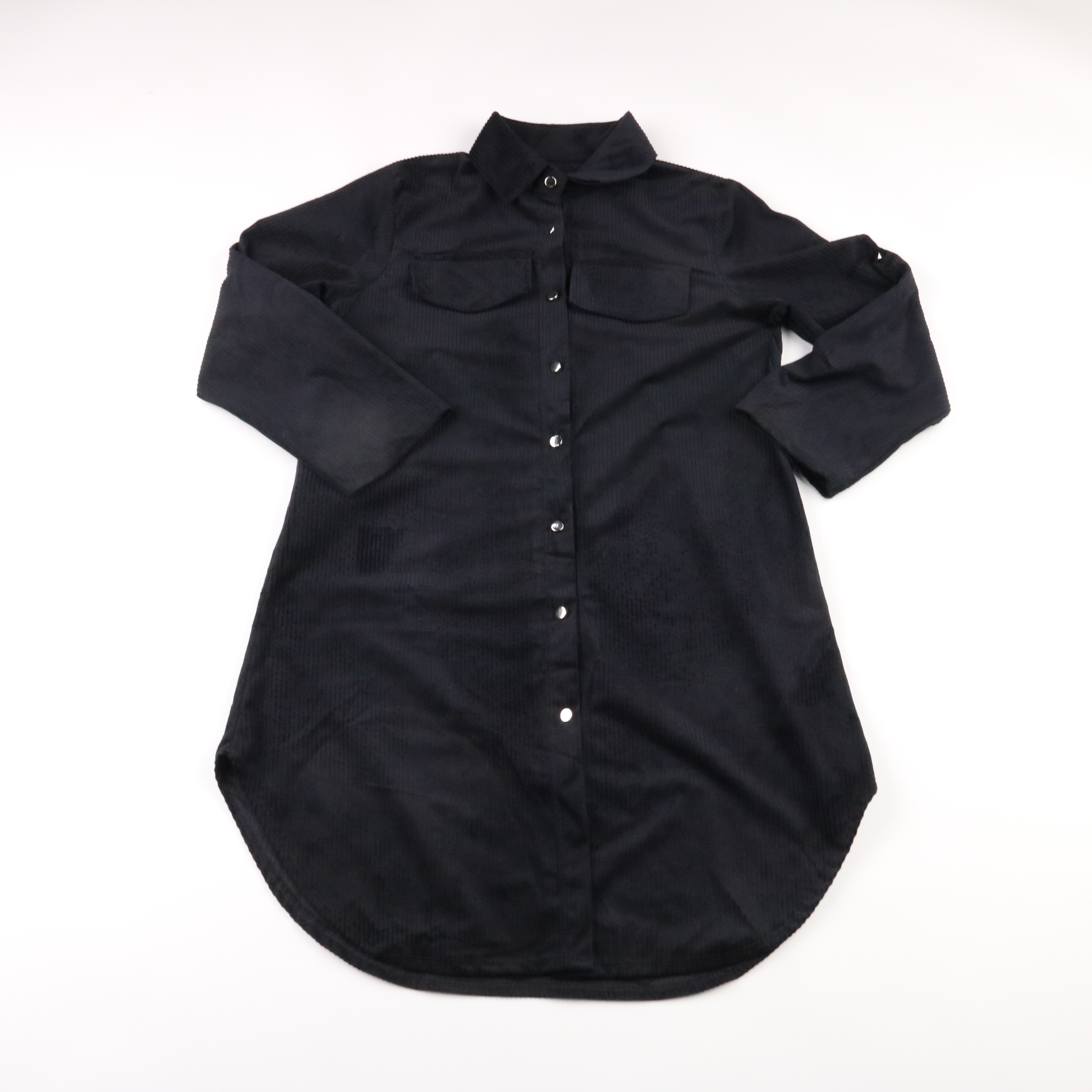 Женская чёрная рубашка на кнопках с длинным рукавом и нагрудными карманами, ткань в мелкий рубчик. Подойдёт для повседневных и офисных образов, можно носить как самостоятельный верх или вторым слоем поверх топа. Практичный полиэстеровый материал почти ...