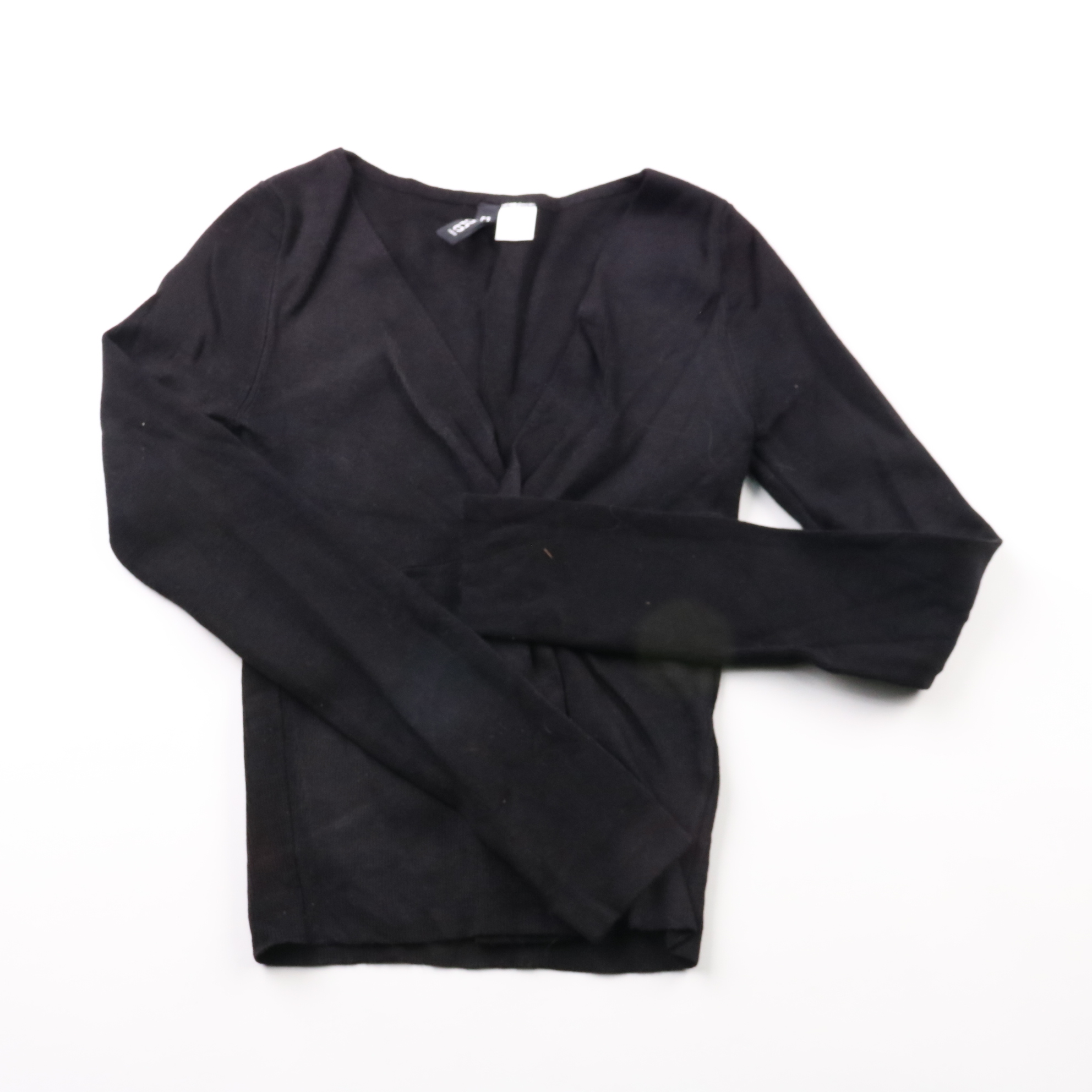 Женская чёрная блузка H&M с V-образным вырезом и длинными рукавами, лаконичная и аккуратно садится по фигуре. Подойдёт для офиса, учебы и выходов, легко сочетается с брюками и юбками. Практичный цвет и трикотажная ткань удобны в носке и не требуют слож...