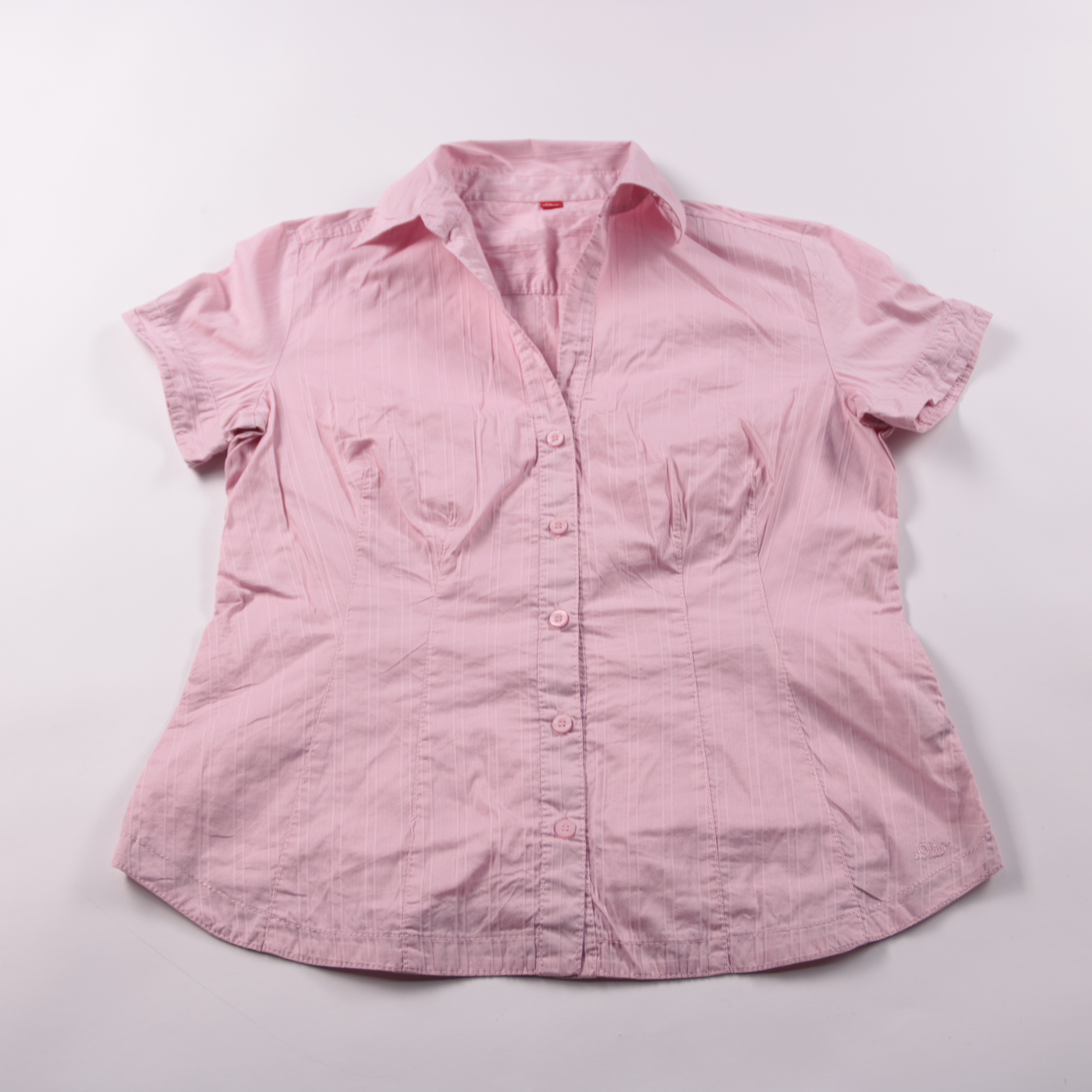 Женская блузка S.Oliver светло-розового цвета с коротким рукавом и застёжкой на пуговицы, силуэт слегка приталенный. Подойдёт для офиса и повседневных летних образов, легко сочетается с джинсами и юбками. Ткань с добавлением эластана, поэтому блузка ко...