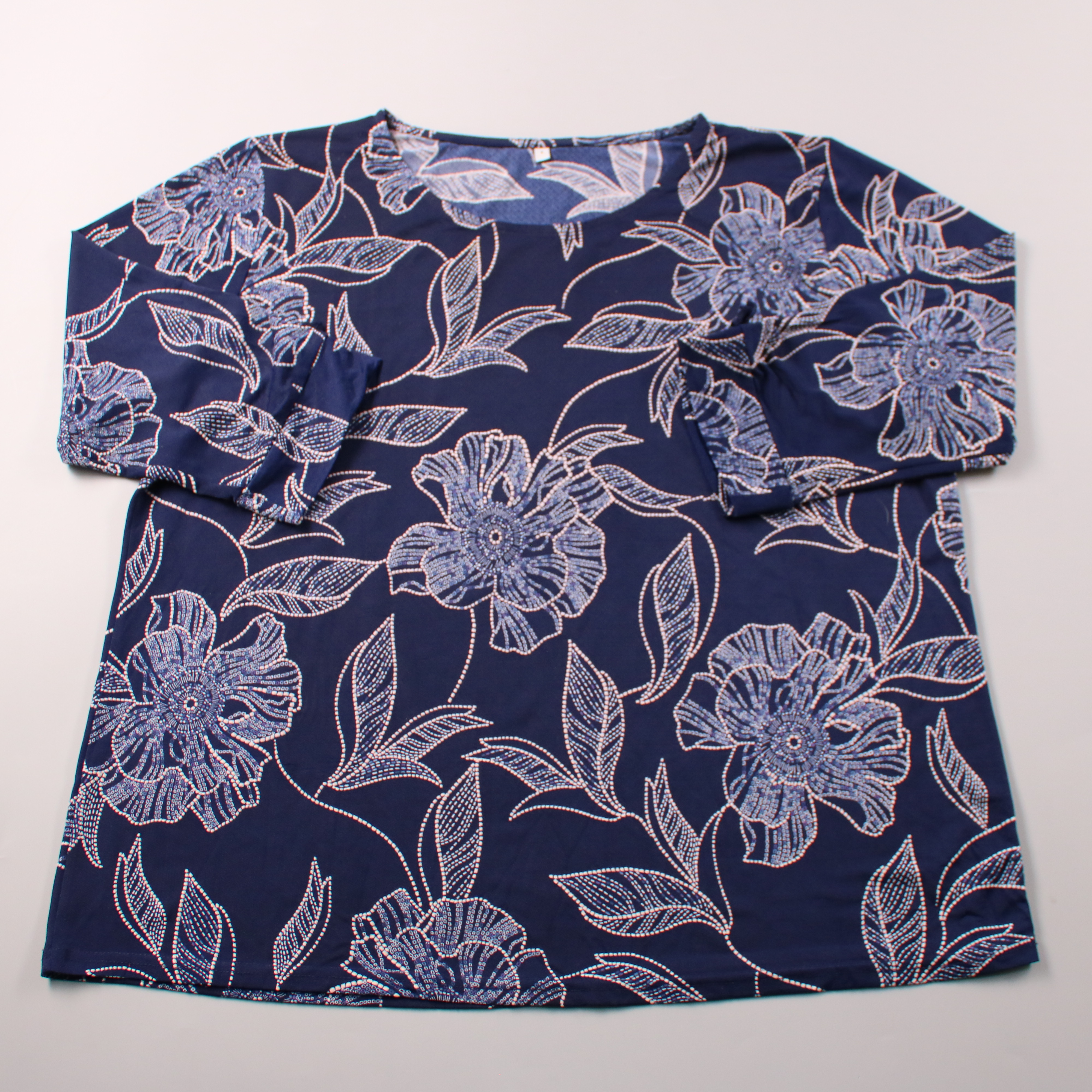 Женская блузка с цветочным принтом на тёмно-синем фоне и рукавом 3/4. Подойдёт для офиса и повседневных образов с джинсами или классическими брюками. Ткань гладкая и почти не мнётся, удобно носить в течение дня.