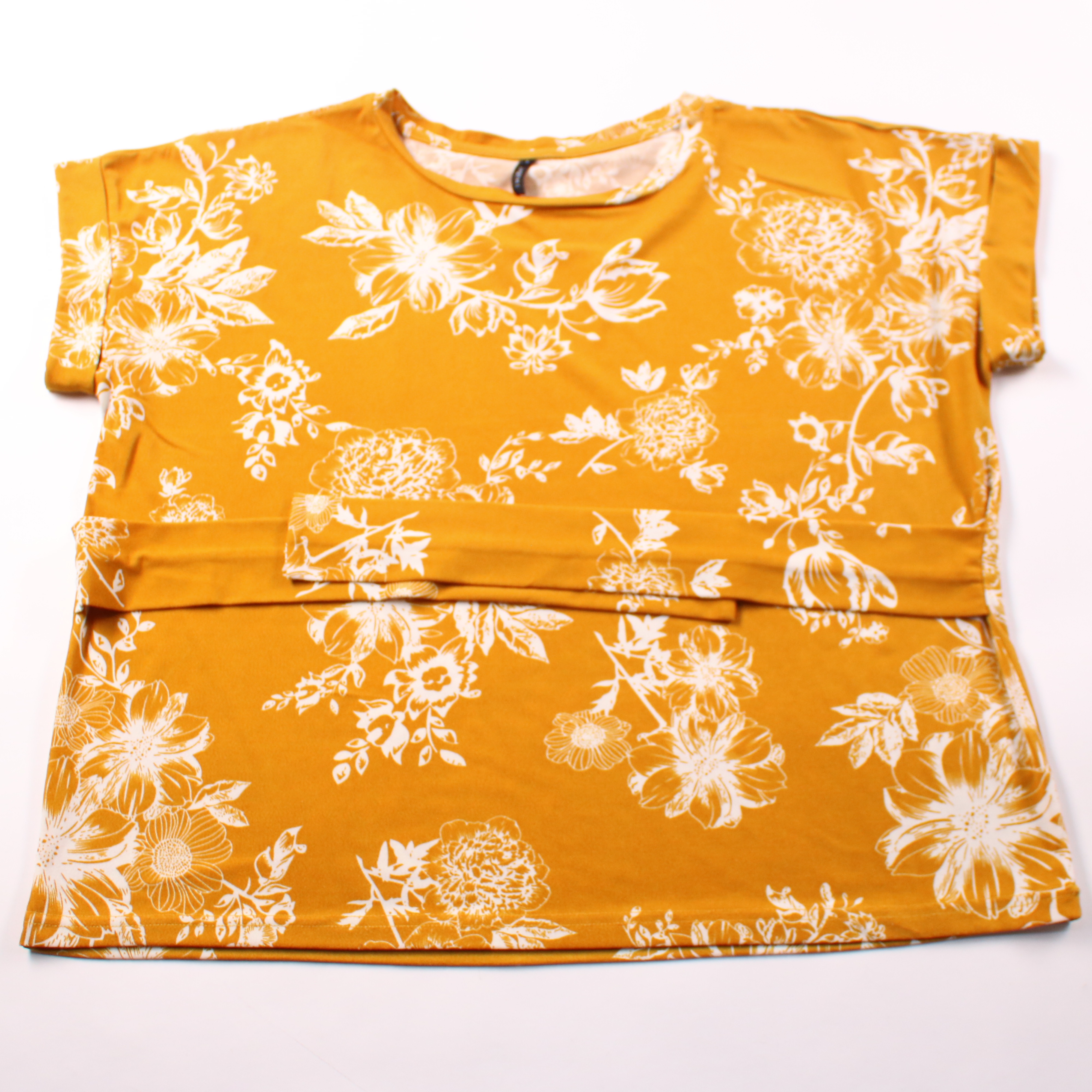 Женская блузка H&M горчичного цвета с белым цветочным принтом и коротким рукавом. Подойдёт для лета и тёплой погоды, хорошо смотрится с джинсами или юбкой в повседневных образах. Материал слегка тянется и комфортно садится по фигуре.
