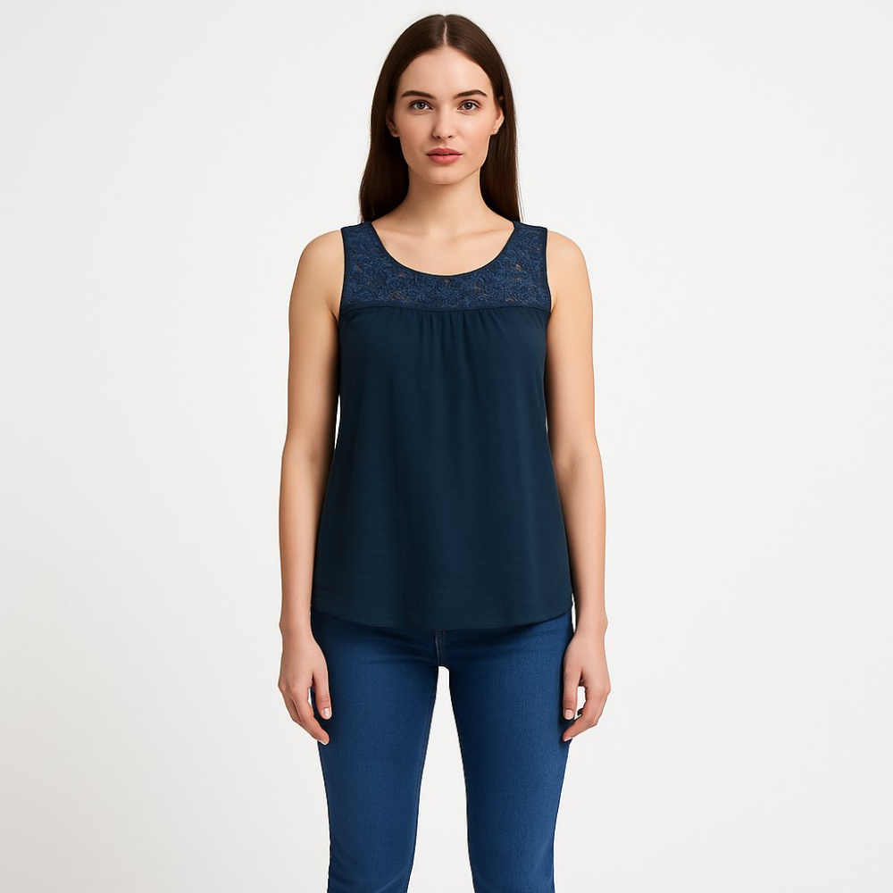 Женский топ Edc тёмно-синего цвета с кружевной вставкой по линии кокетки и округлым вырезом. Подойдёт для повседневных образов и офиса с жакетом, хорошо сочетается с джинсами и юбками. Лёгкая ткань почти не мнётся и быстро сохнет.