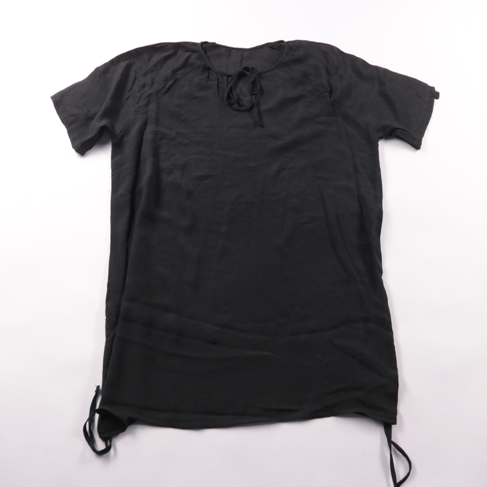Чёрная блузка Shein свободного кроя с коротким рукавом и завязками у горловины. Подойдёт для повседневных образов и офиса в сочетании с брюками или юбкой. Лёгкий материал не занимает много места и удобно берётся с собой.