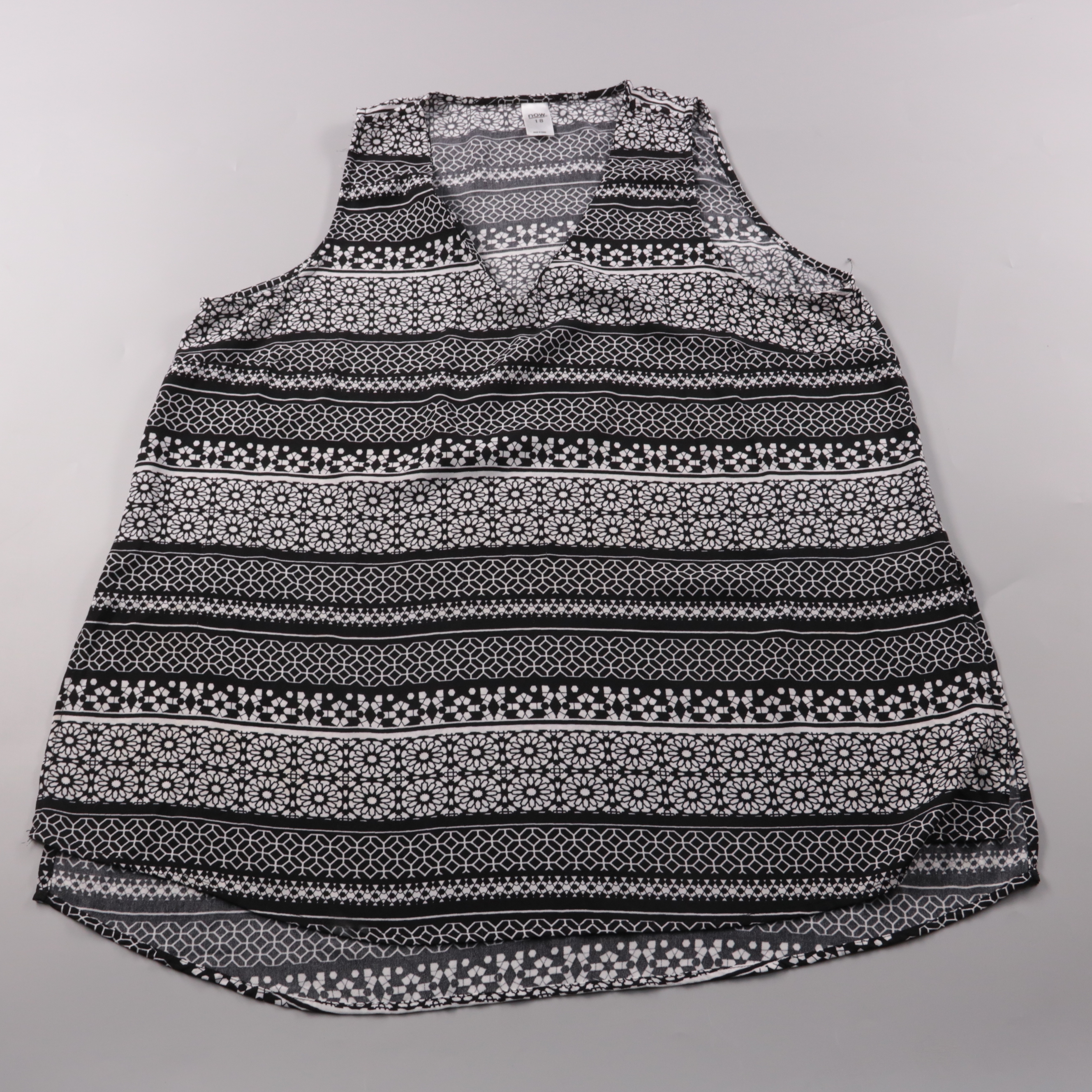 Женская блузка Now без рукавов, чёрно-белая с полосатым геометрическим принтом. Подойдёт для лета и тёплого офиса, легко сочетается с джинсами, брюками и юбкой. Ткань из полиэстера практически не мнётся и быстро сохнет.