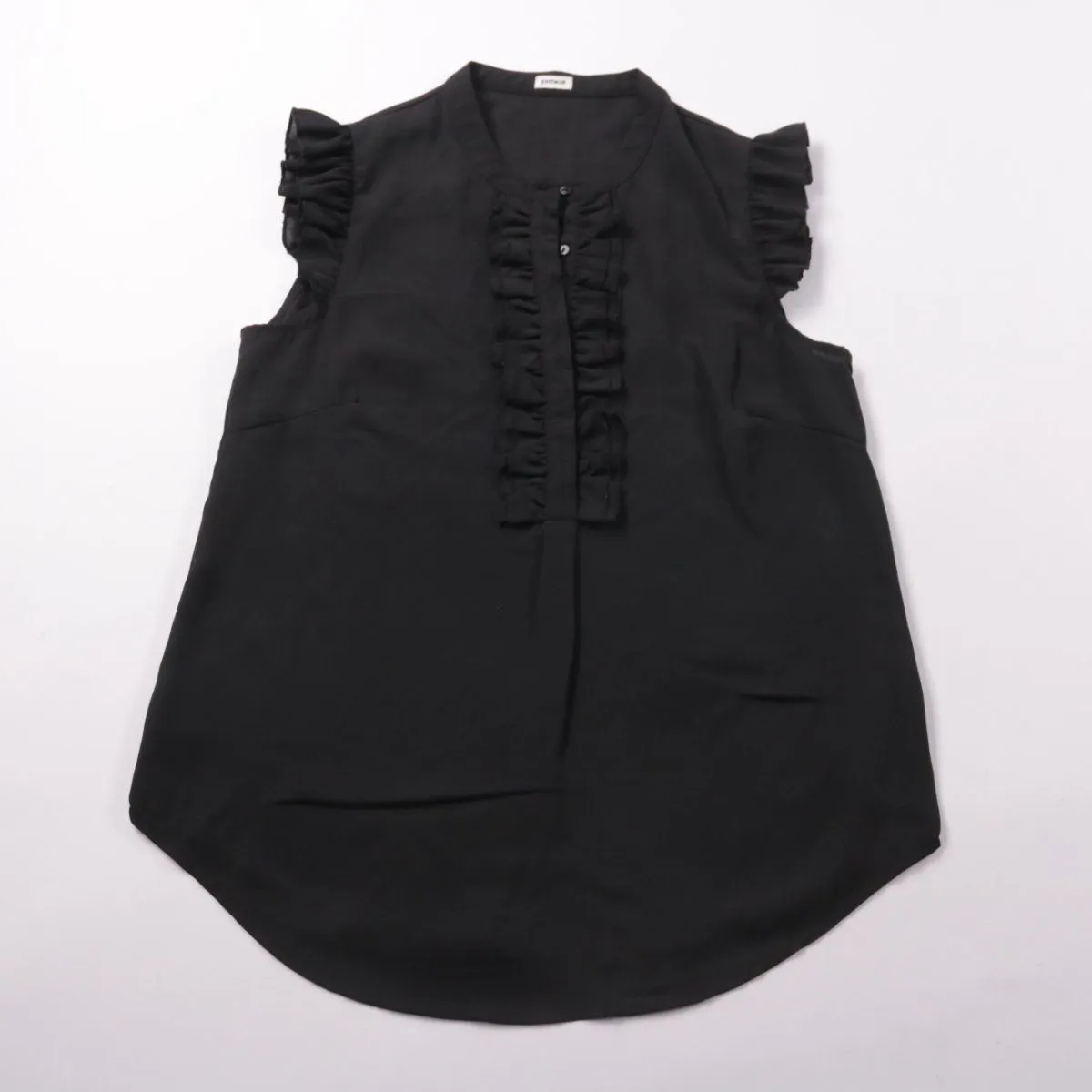 Женская блузка Pimkie чёрного цвета без рукавов, с оборками на плечах и планкой с рюшами спереди. Подойдёт для офиса и на выход, легко сочетается с брюками или юбкой. Практичный плюс — немаркий цвет и универсальный фасон.