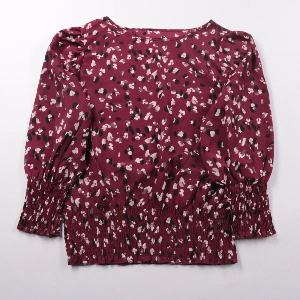 Блузка Shein бордового цвета с мелким принтом и длинными рукавами, низ и манжеты на сборке. Подойдёт для повседневных образов с джинсами или юбкой в прохладную погоду. Лёгкий полиэстер почти не мнётся и быстро сохнет.