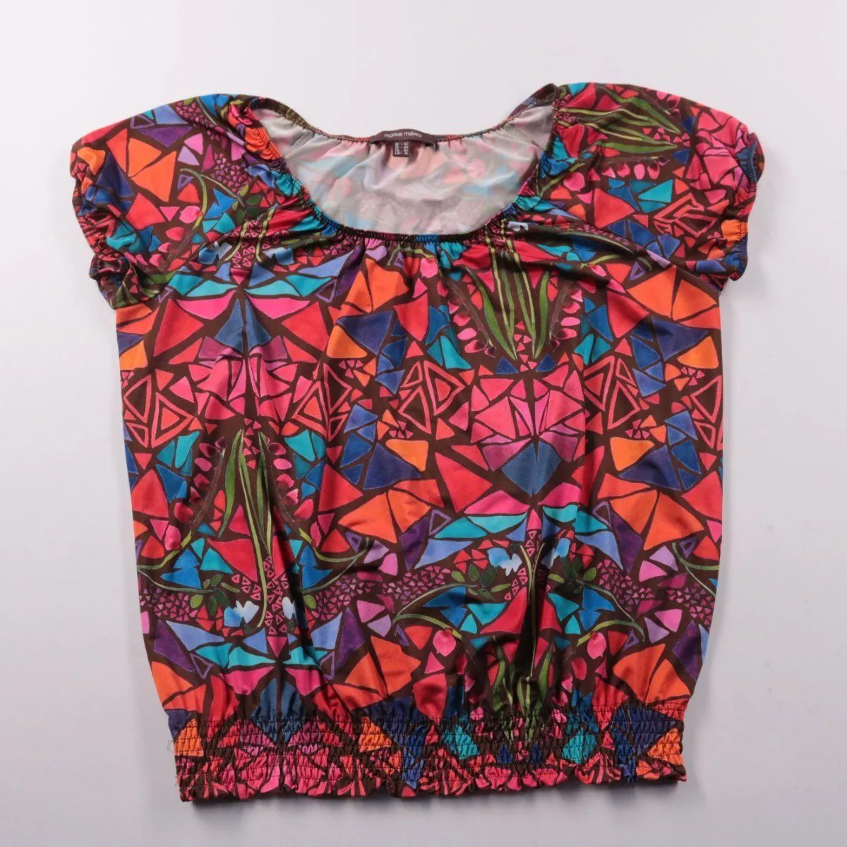 Женская блузка Marie Méro с ярким геометрическим разноцветным принтом, коротким рукавом и присборенной горловиной. Подойдёт для лета и отпусков, хорошо смотрится с однотонными брюками или юбкой. Эластичная ткань и резинка по низу делают посадку удобной и не сковывают движения.