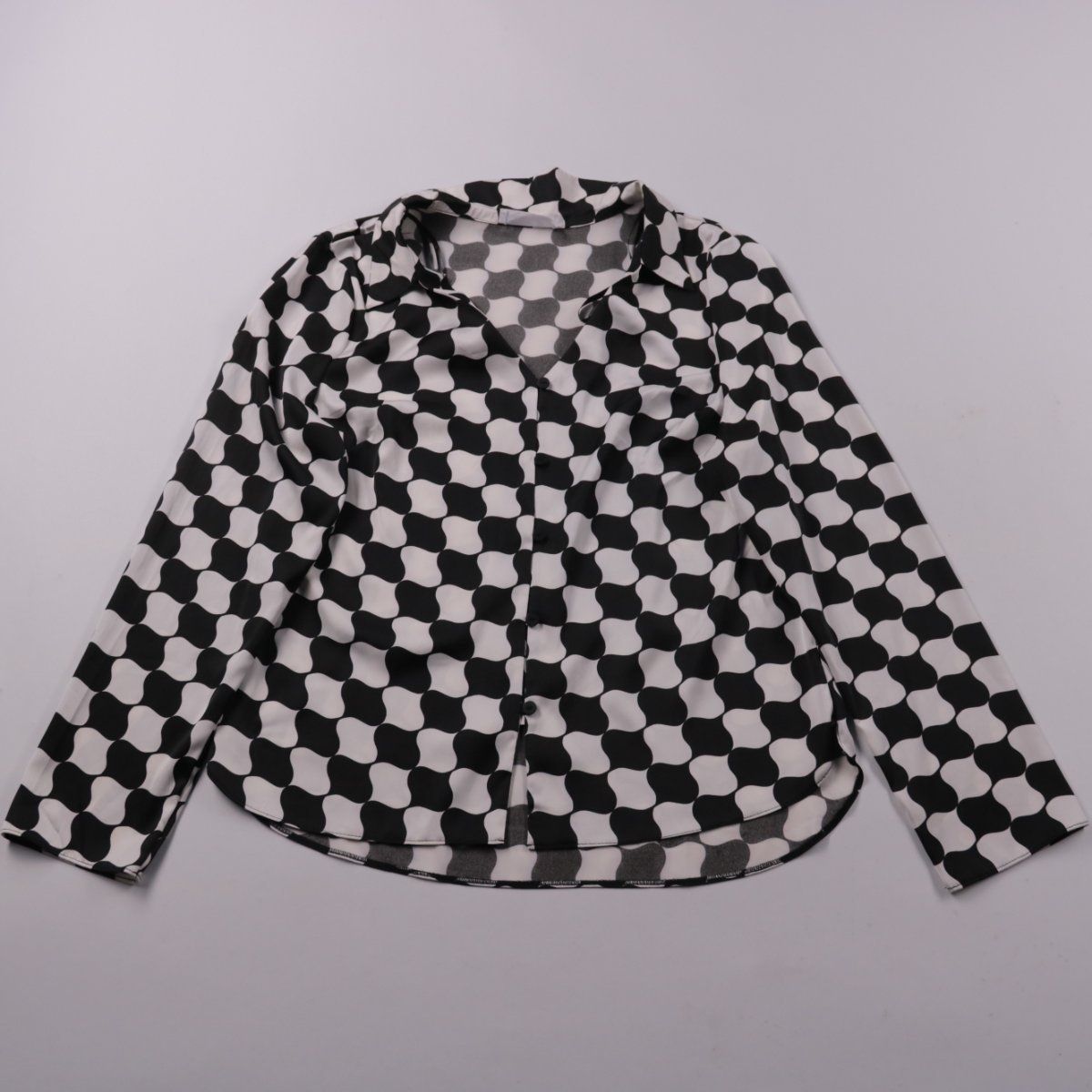 Женская блузка Primark с отложным воротником и длинным рукавом, выполнена в чёрно-белом геометрическом принте. Подойдёт для офиса и повседневных образов с джинсами или брюками. Лёгкая ткань практически не мнётся и удобна в уходе.