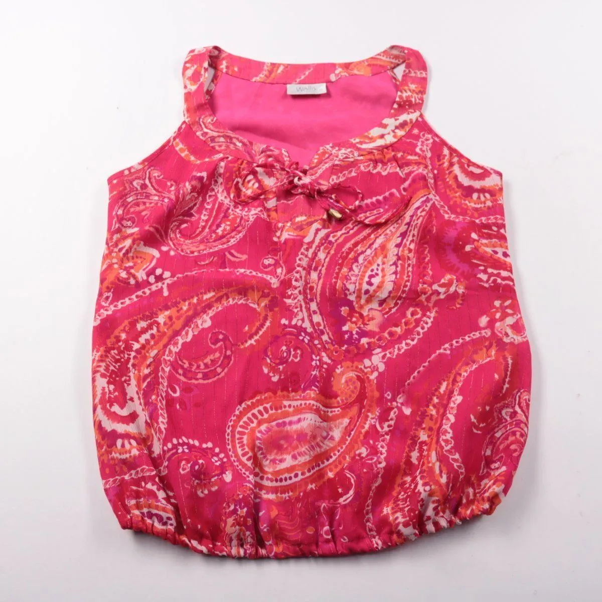 Женская блузка Wallis Petite с ярким розовым принтом пейсли и завязкой-бант на горловине. Подойдёт для летних образов и отпуска, легко сочетается с однотонными брюками или юбкой. Эластичная резинка по низу помогает посадке и не задирается при движении.