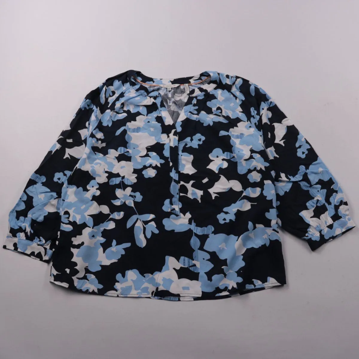 Блузка Tom Tailor из 100% вискозы, с V-образным вырезом и цветочным принтом в голубых и белых тонах на чёрном фоне. Подойдёт для офиса и повседневных образов, хорошо сочетается с джинсами и однотонными брюками. Вискоза лёгкая и дышащая, комфортна в носке.