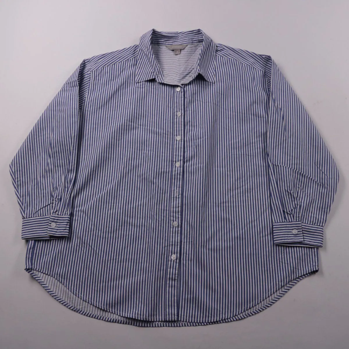Хлопковая рубашка Suzanne Grae в сине-белую полоску с воротником и застёжкой на пуговицы. Подойдёт для офиса и повседневных образов, хорошо смотрится как навыпуск, так и заправленной. Натуральный хлопок дышит и комфортен в носке.