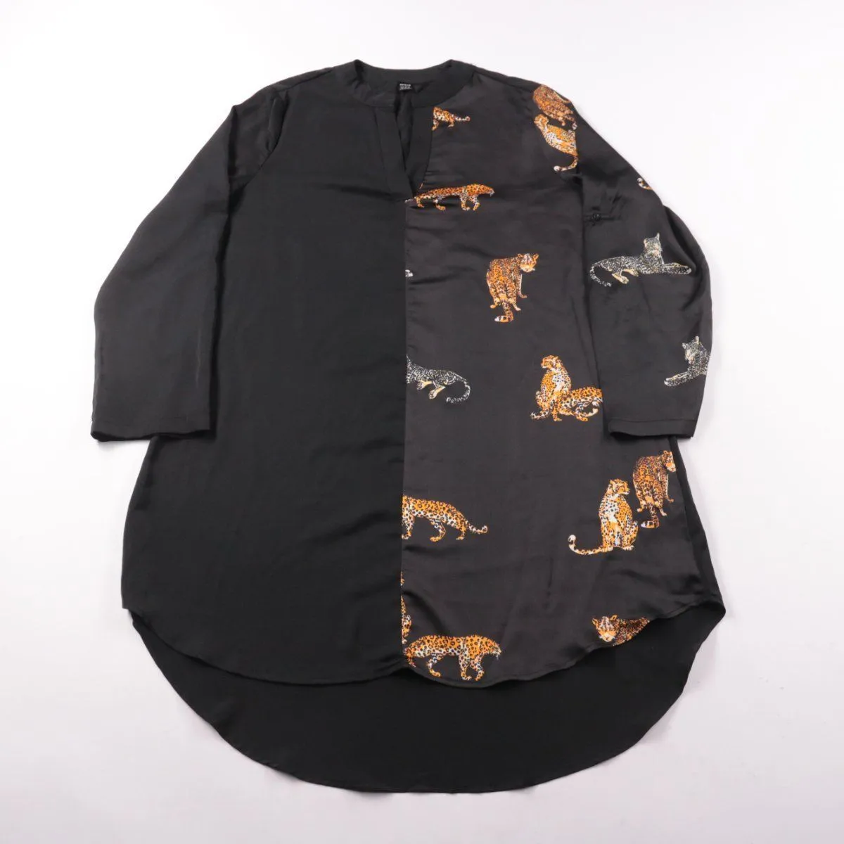 Удлинённая блузка Shein из чёрного полиэстера, с контрастной вставкой и принтом с кошачьими. Подойдёт для повседневных образов и офиса, хорошо смотрится как с брюками, так и с леггинсами. Материал лёгкий и быстро сохнет, а удлинённая спинка добавляет комфорт при движении.