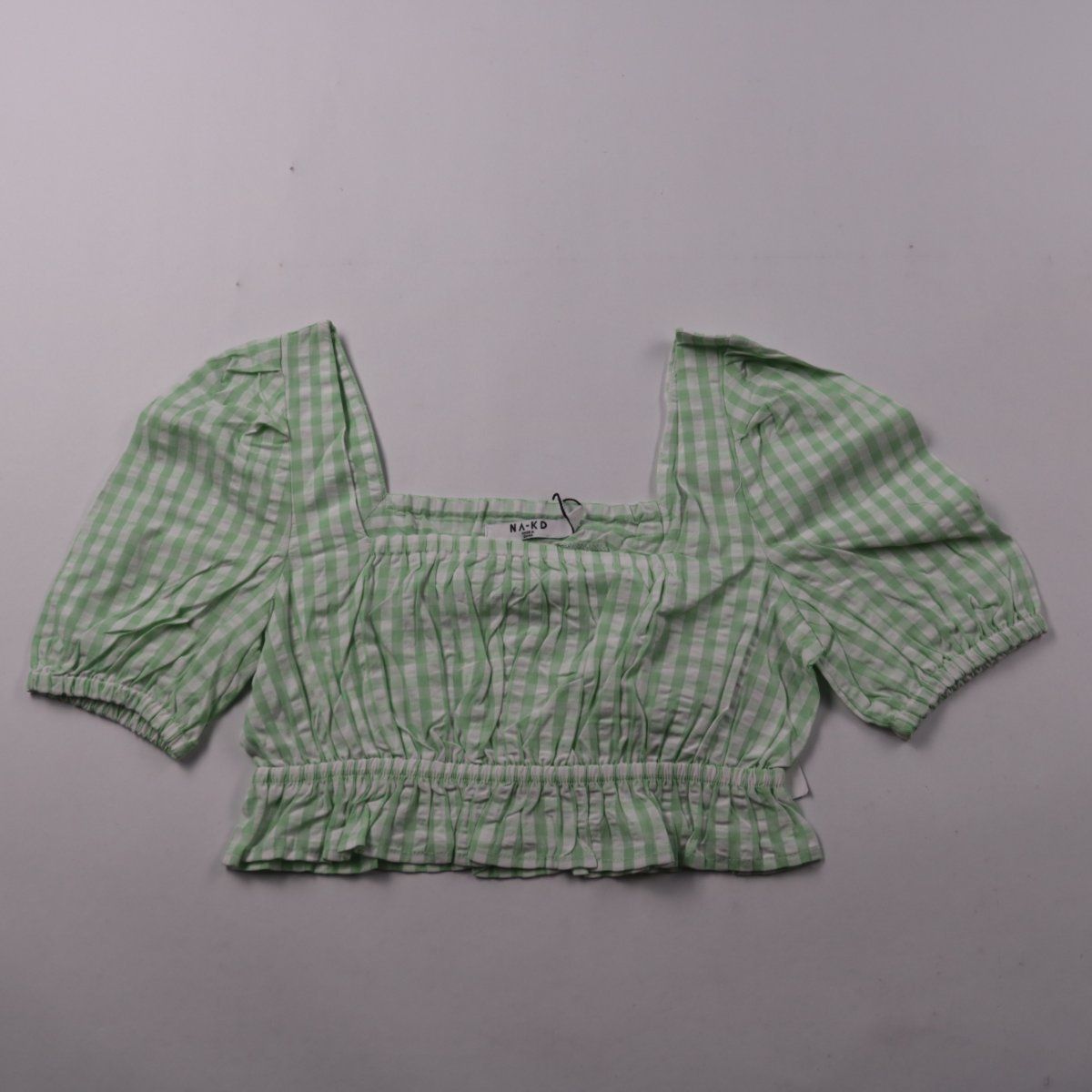Укороченная блузка NA-KD в зелёно-белую клетку с квадратным вырезом и объёмными рукавами. Подойдёт для летних образов с джинсами, юбками и шортами, а эластичная талия и манжеты делают посадку удобной.