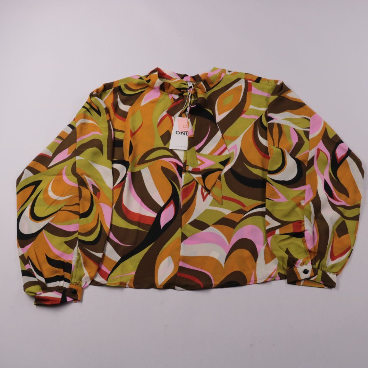 Женская блузка ONLY с абстрактным разноцветным принтом и завязками у горловины, длинный рукав на манжете. Подойдёт для офиса и повседневных образов с брюками или джинсами. Лёгкий полиэстер практичен в уходе и быстро сохнет.