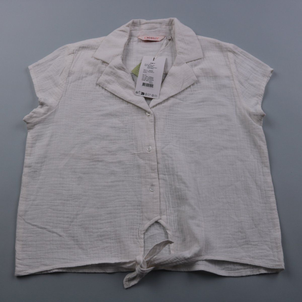 Женская рубашка ONLY молочно-белого цвета с отложным воротником и коротким рукавом. Спереди застёгивается на пуговицы, внизу завязка (knot), удобно для летних образов и отдыха. Натуральный хлопок хорошо пропускает воздух и приятен к телу.