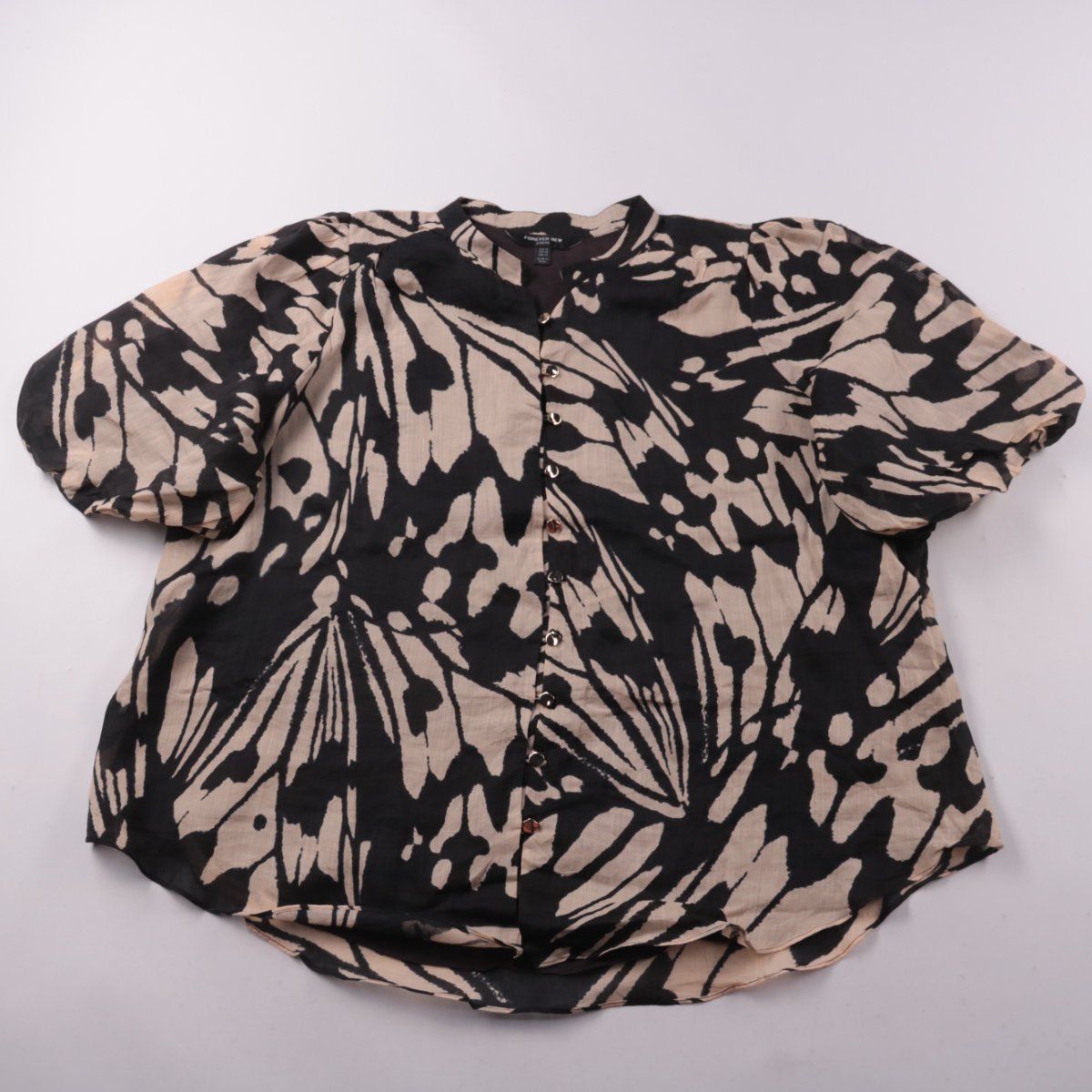 Блузка Forever New Curve с коротким рукавом и застёжкой на пуговицы, в контрастном чёрно-бежевом принте. Подойдёт для тёплой погоды и многослойных образов, крой свободный. Натуральная основа из рами и подкладка из вискозы делают вещь более комфортной в носке.