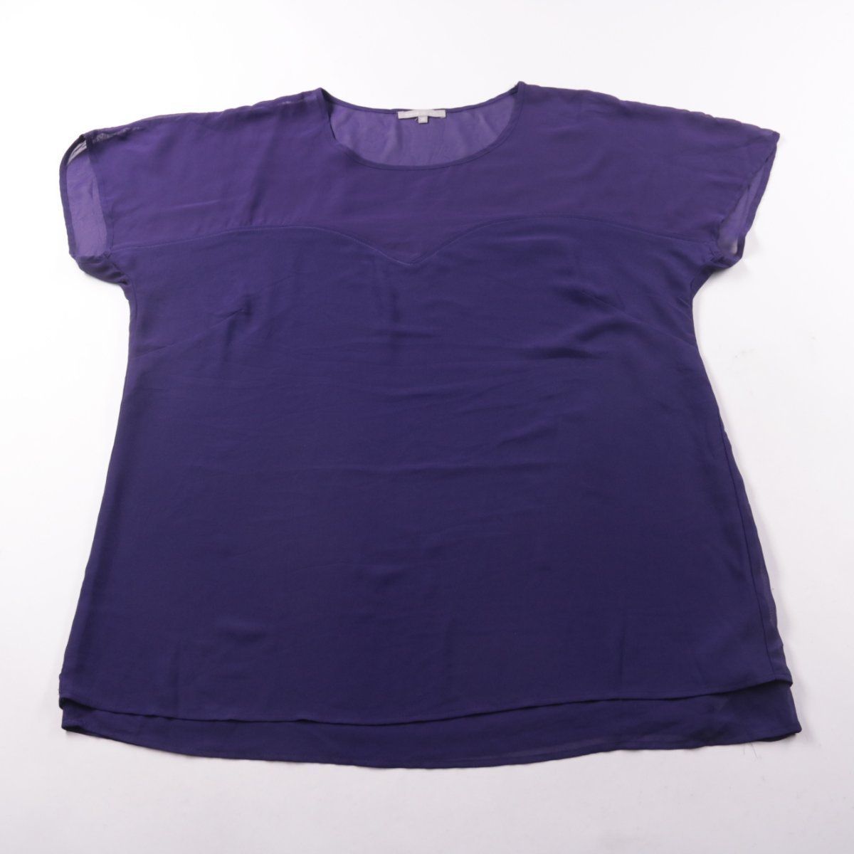 Женская блузка bellecurve тёмно-фиолетового цвета с коротким рукавом и полупрозрачным верхним слоем. Подойдёт для офиса и повседневных образов с юбкой или брюками. Лёгкая ткань комфортна в помещении и в тёплую погоду.