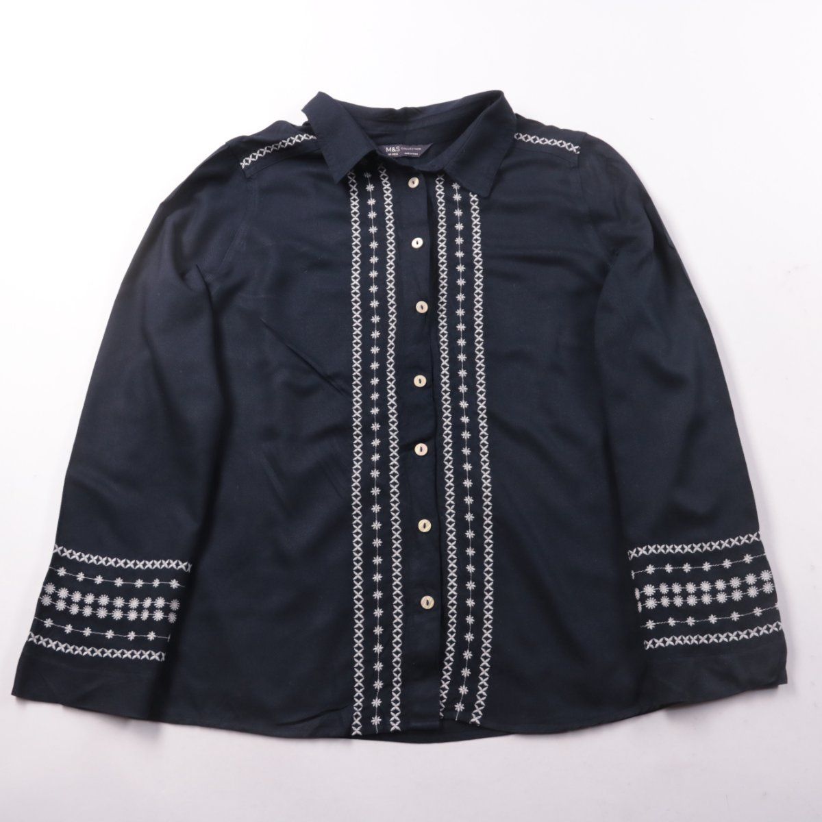 Блузка M&S Collection тёмно-синего цвета с белой вышивкой и застёжкой на пуговицы, с воротником и длинным рукавом. Подойдёт для повседневных и офисных образов в любое время года. Лёгкая вискозная ткань комфортна в носке и хорошо драпируется.