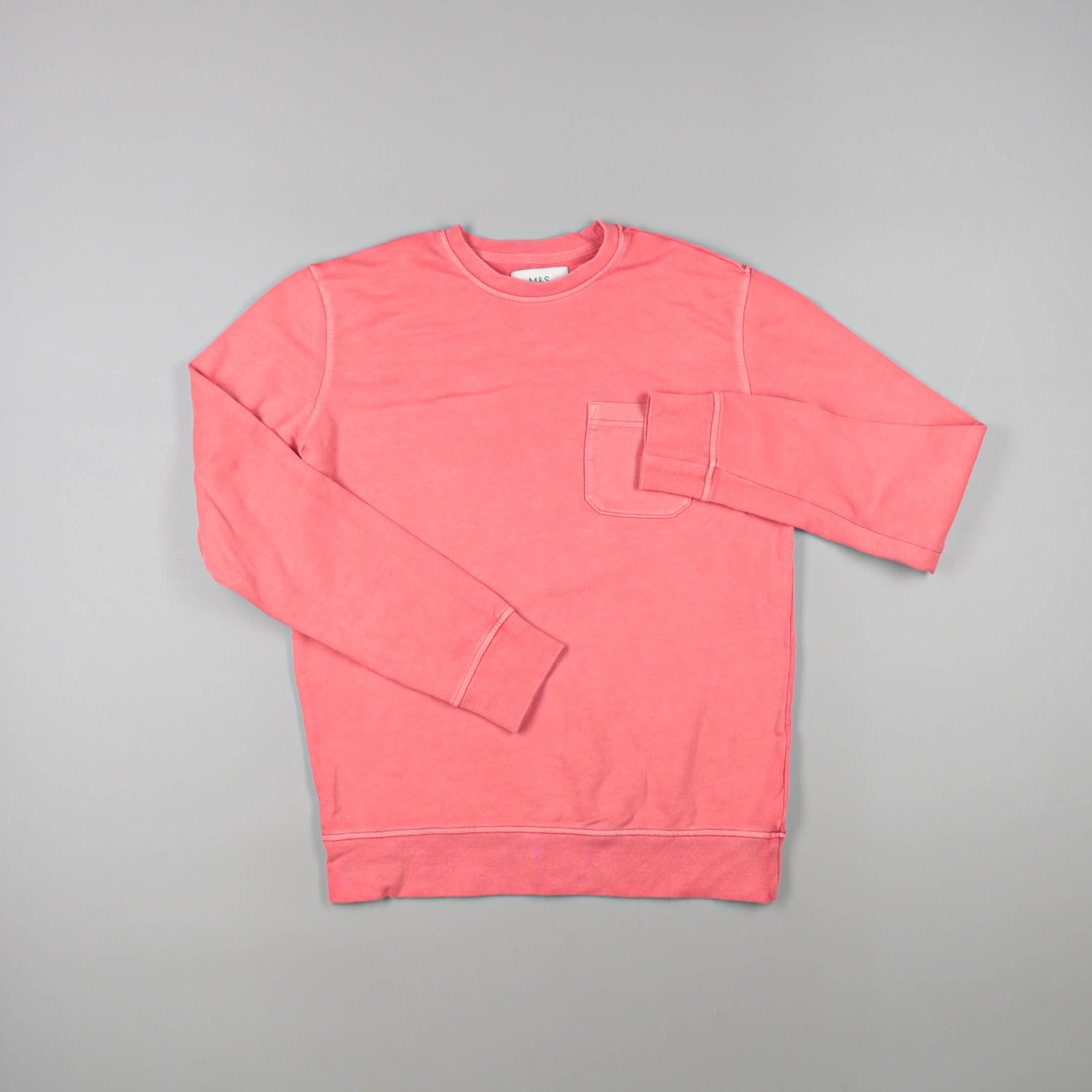 Женский свитшот M&S кораллово-розового цвета с круглым вырезом и накладным карманом на груди. Подойдёт для повседневных образов и прогулок, хорошо сочетается с джинсами и спортивными брюками. Мягкий трикотаж комфортно носится и не сковывает движения.