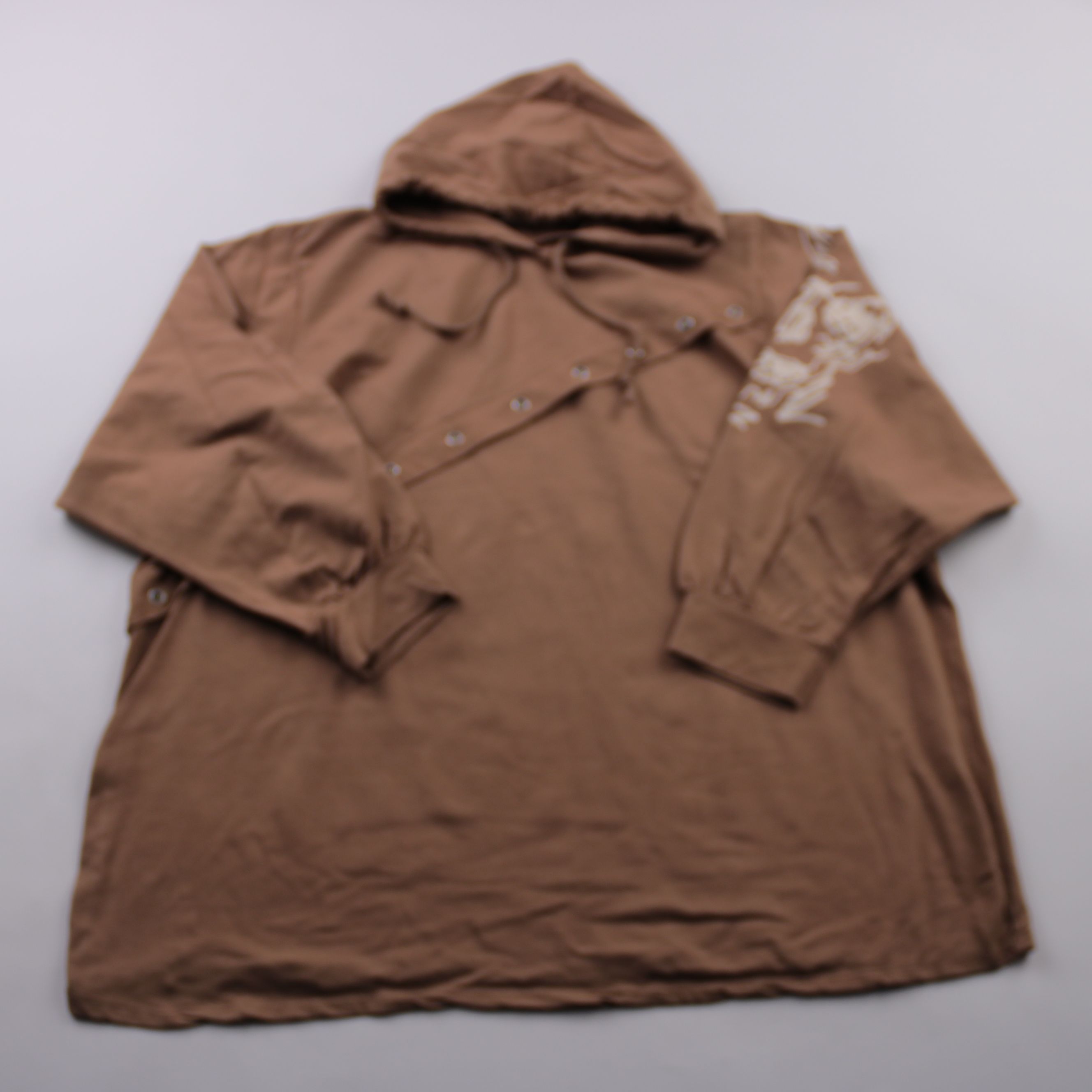 Худи без указания бренда в коричневом цвете, с капюшоном и декоративной застёжкой/планкой на кнопках спереди. Подойдёт для повседневных образов в прохладную погоду, можно носить слоями. Практичное преимущество — свободный крой и капюшон, которые добавл...