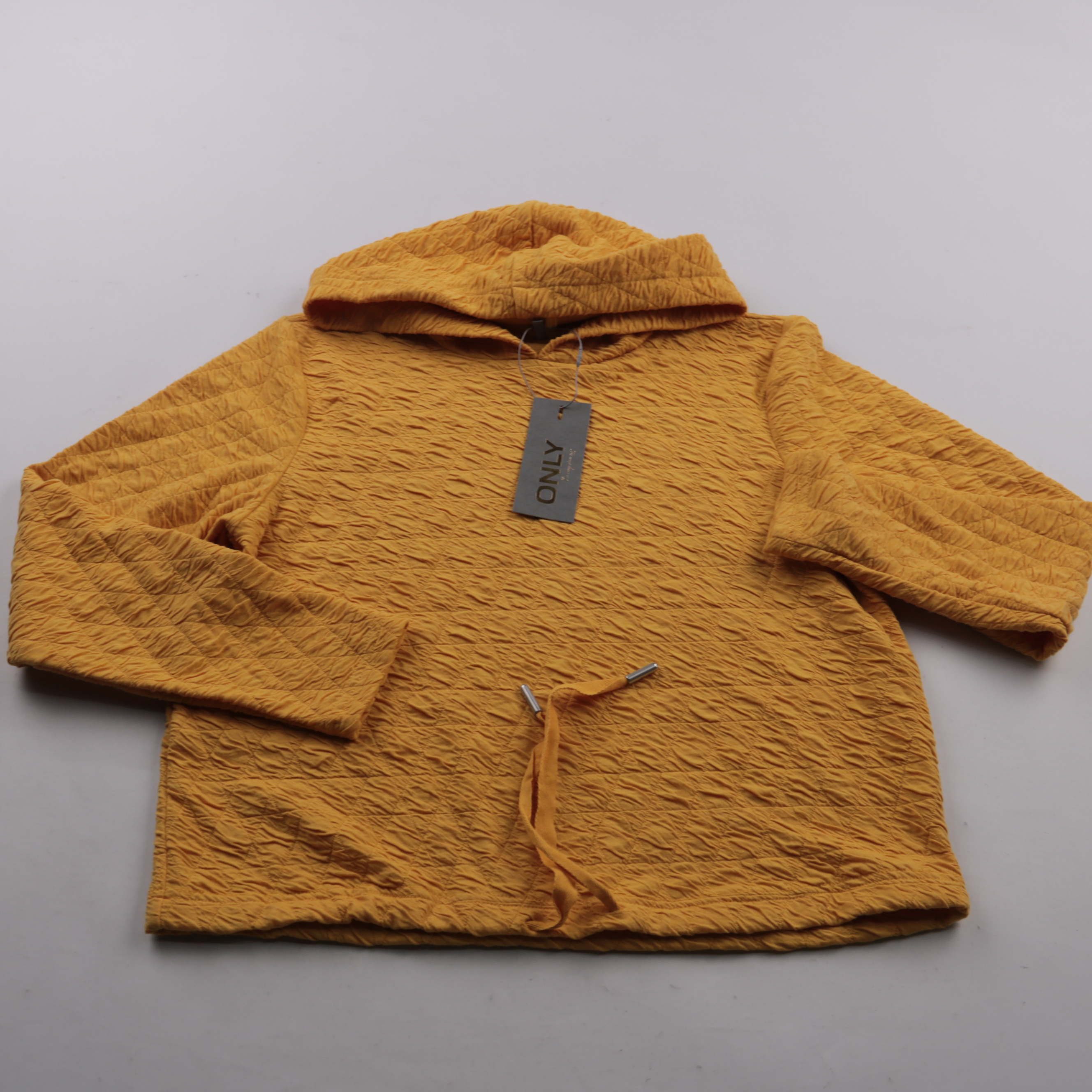 Толстовка Only с капюшоном в цвете горчичный, фактурная ткань с лёгким жатым эффектом. Подойдёт для повседневной носки и прогулок в прохладную погоду, хорошо смотрится с джинсами и спортивными брюками. Материал тянется и не требует сложного ухода.