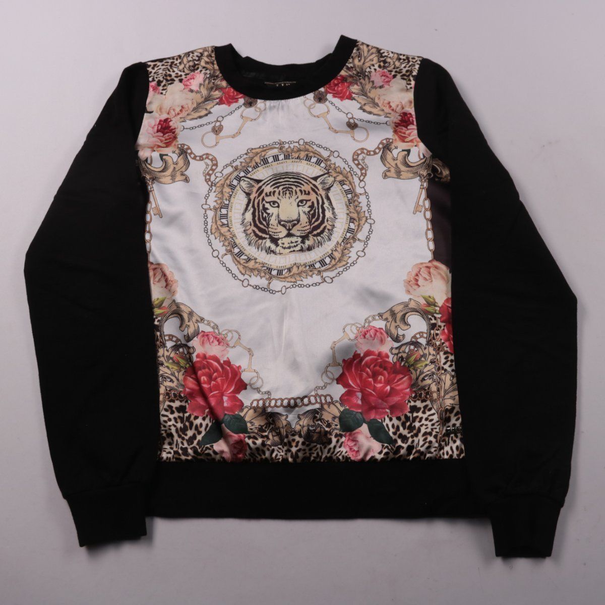 Женский свитшот Lipsy London с круглым вырезом и длинным рукавом. Спереди яркий принт с тигром, цветами и цепями, поэтому вещь подойдёт для повседневных образов как акцент. Манжеты и пояс на резинке помогают свитшоту лучше держать форму.