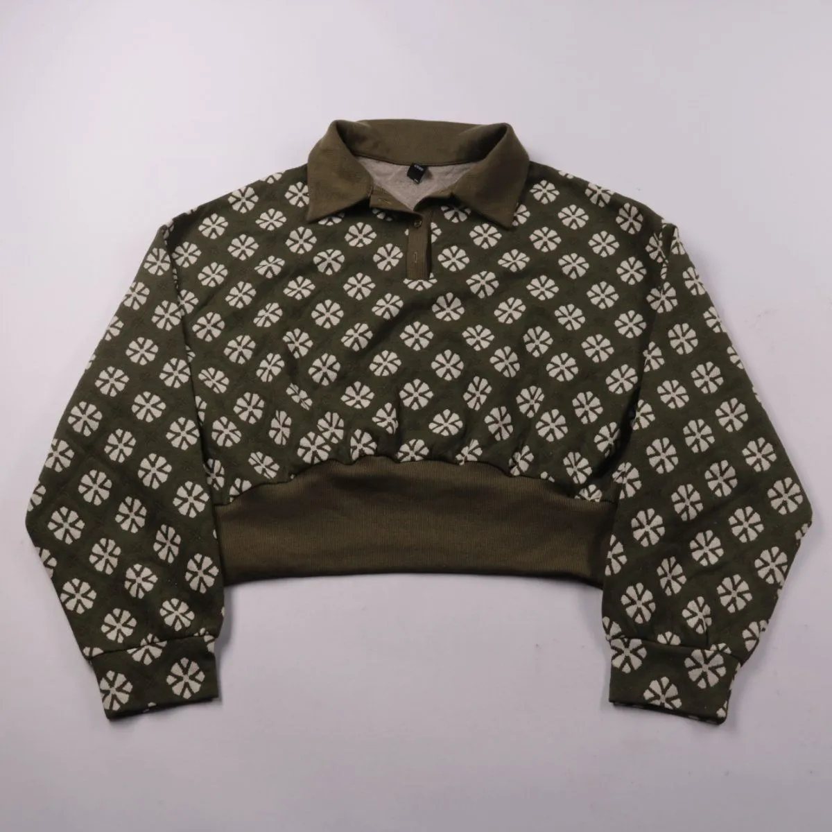 Укороченный свитшот CIDER оливкового цвета с белым принтом и воротником-поло на пуговицах. Подойдёт для повседневных образов в прохладную погоду и как слой под куртку. Ткань тянется за счёт добавления спандекса и комфортно садится по фигуре.