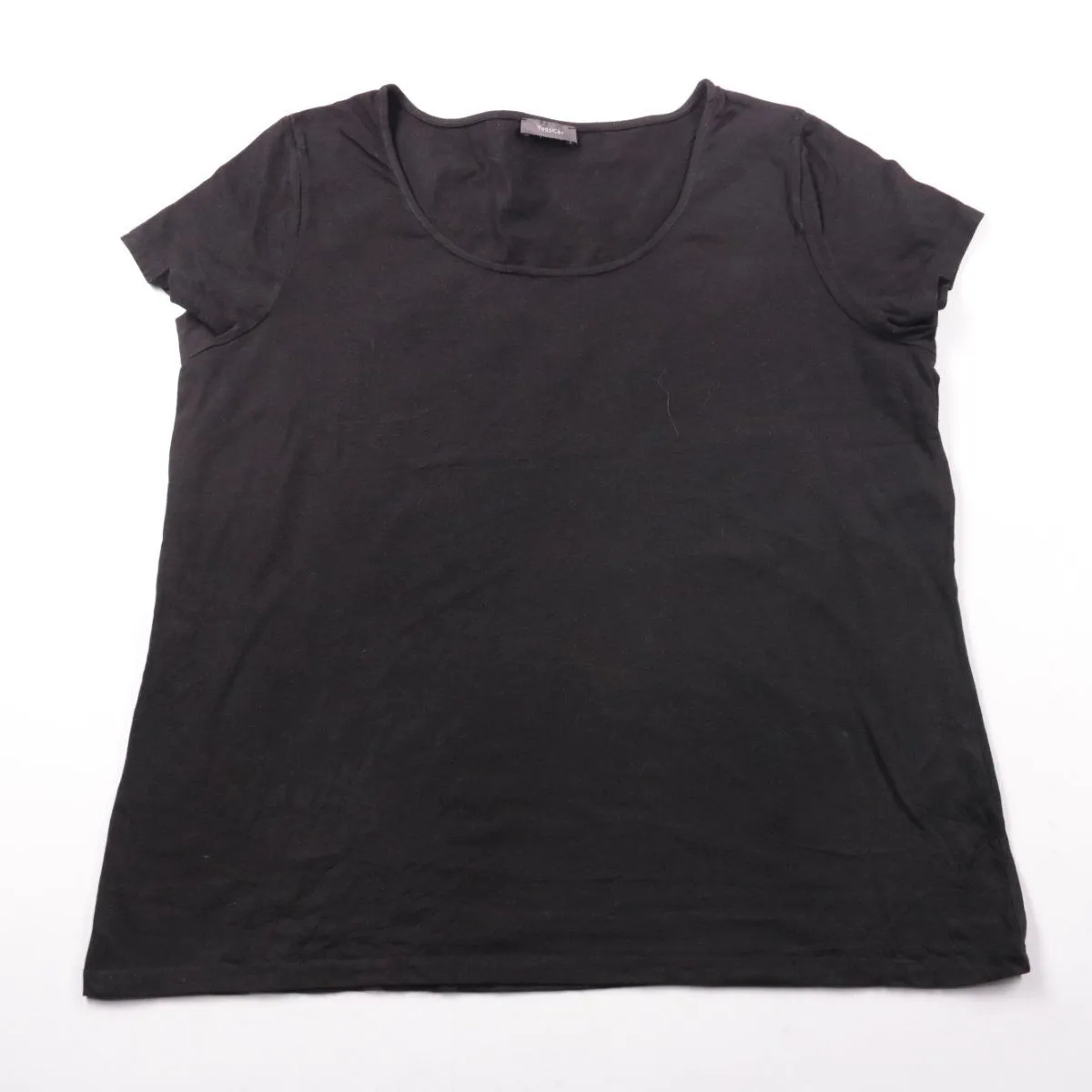 Женская чёрная футболка Yessica с округлым вырезом и коротким рукавом. Подойдёт для повседневных образов и как базовый слой под жакет или кардиган. Смесь модала и хлопка мягкая на ощупь, а эластан помогает ткани лучше держать форму.
