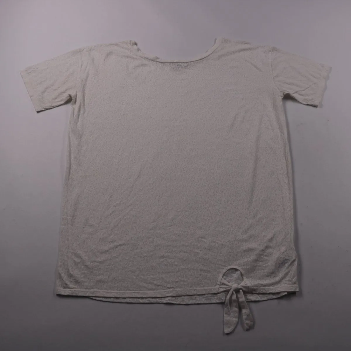 Женская футболка Next молочного оттенка с коротким рукавом и круглым вырезом. Снизу есть декоративная завязка сбоку — удобно регулировать посадку по талии. Подойдёт для повседневных летних образов и хорошо сочетается с джинсами и шортами.