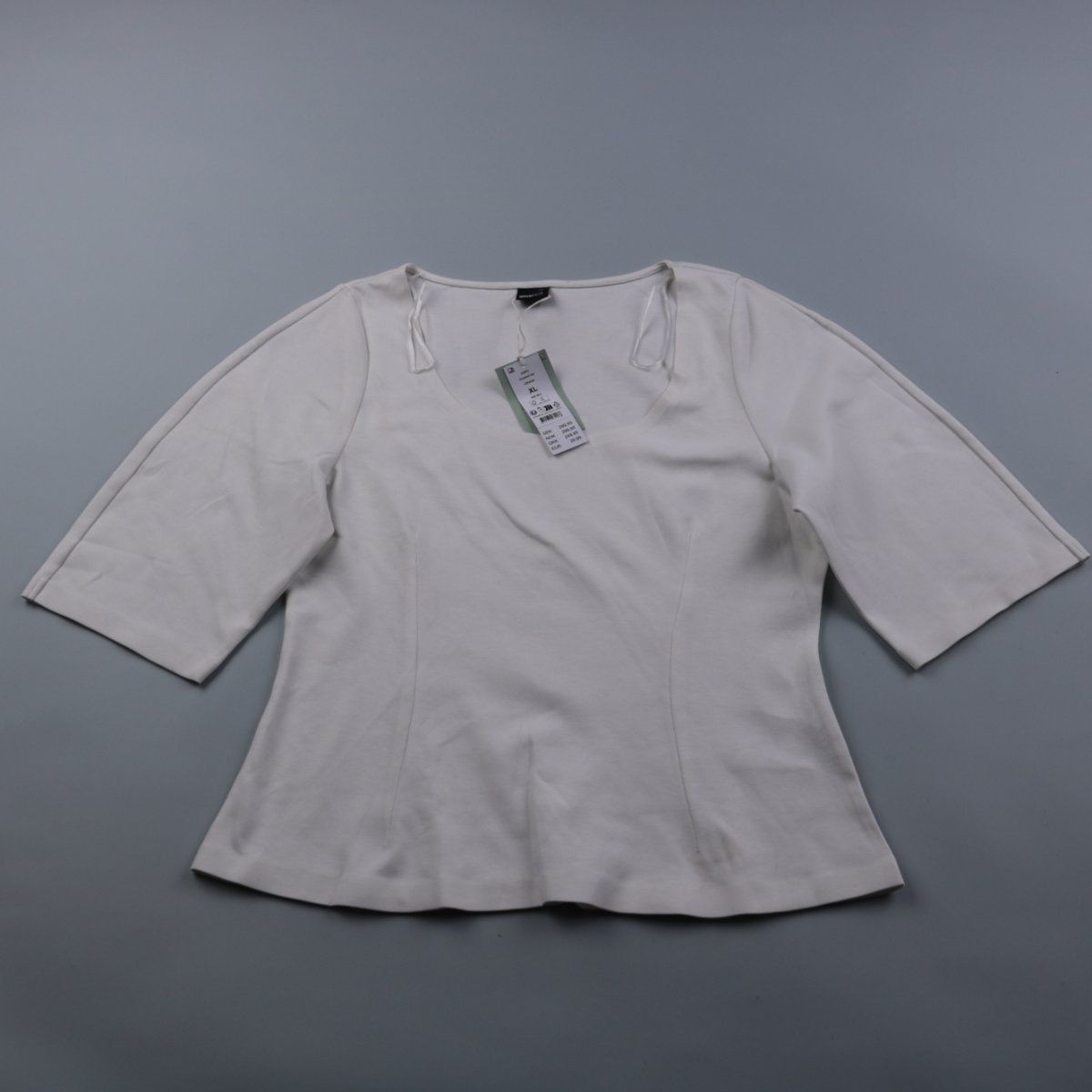 Женский лонгслив Gina Tricot белого цвета с широким вырезом и рукавом 3/4. Приталенный крой с вытачками подойдёт для повседневных образов и офиса. Хорошо сочетается с джинсами и юбками и легко наслаивается под жакет.