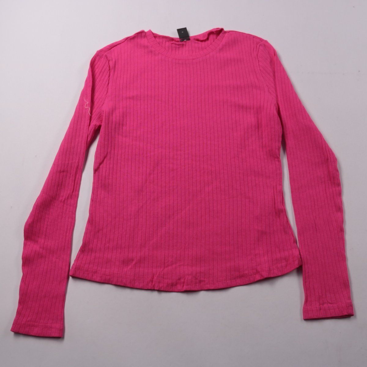 Женский лонгслив SHEIN ярко-розового цвета в мелкий рубчик, с круглым вырезом и длинным рукавом. Подойдёт для повседневной носки и как базовый слой в прохладную погоду. Ткань с добавлением эластана хорошо тянется и комфортно садится по фигуре.
