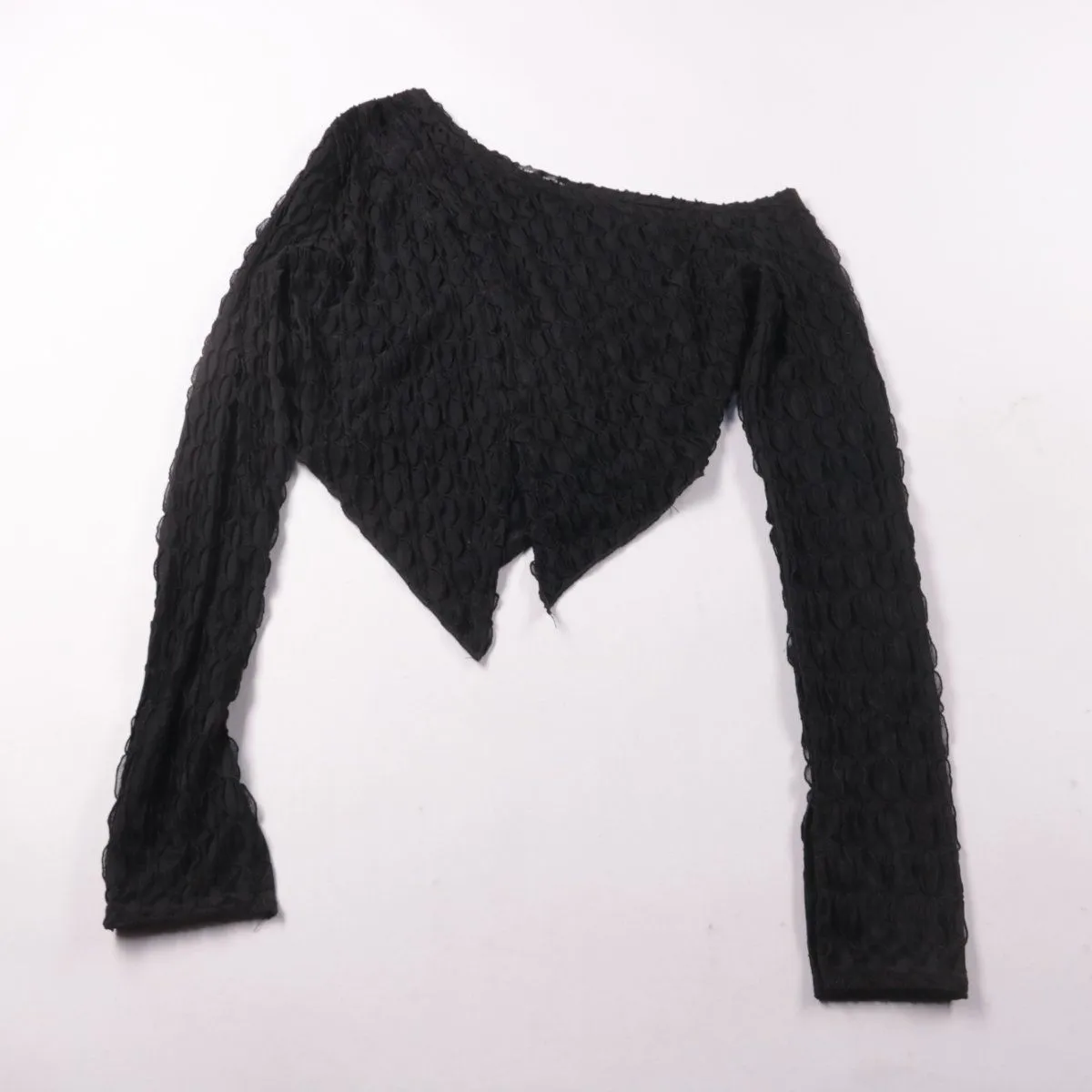 Чёрный фактурный лонгслив-топ Shein с открытыми плечами и асимметричной линией низа. Подойдёт для вечерних образов и сочетаний с джинсами или юбкой с высокой посадкой. Эластичная ткань комфортно садится по фигуре.