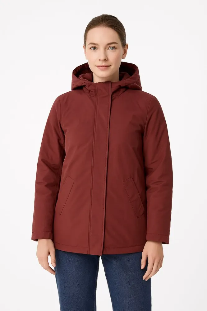 Женская демисезонная куртка Fiore в бордовом цвете с капюшоном и удобными боковыми карманами. Подойдёт для повседневной носки в прохладную погоду весной и осенью. Лёгкий утеплитель и нейлоновая подкладка делают её практичной в уходе и комфортной в носке.