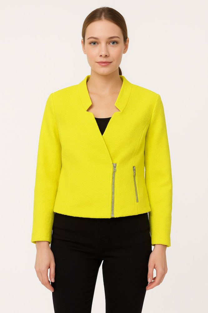 Жакет-куртка SoSoire из фактурной ткани яркого жёлтого цвета, с асимметричной застёжкой на молнию и карманами на молниях. Подойдёт для демисезона и прохладных вечеров, легко сочетается с брюками и юбками. Практичный плюс — подкладка из полиэстера, комф...