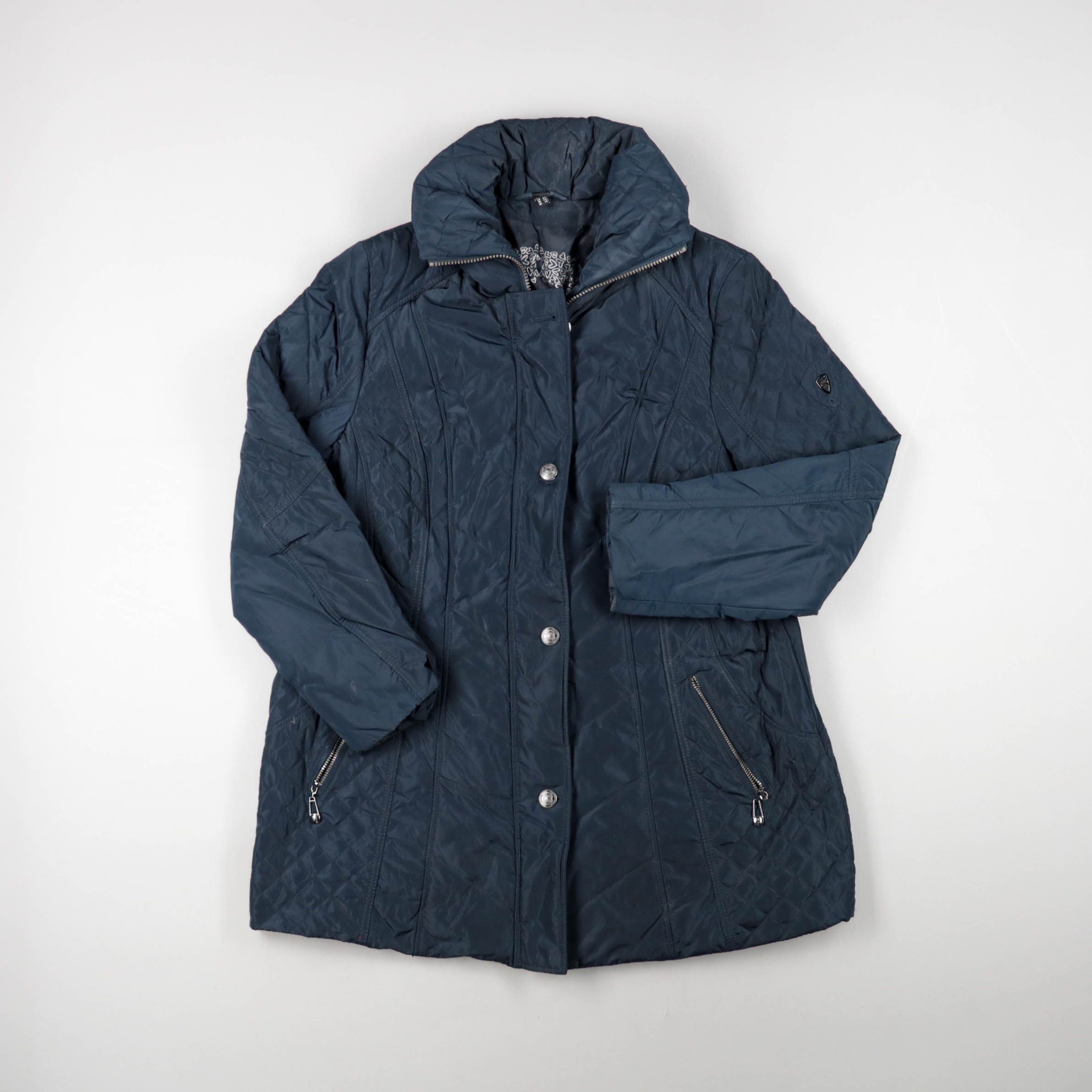 Женская стёганая зимняя куртка тёмно-синего цвета с высоким объёмным воротником и застёжкой на молнию и кнопки. Подойдёт для повседневных прогулок и города в холодную погоду. Практичное преимущество — карманы на молнии, чтобы вещи не выпадали.