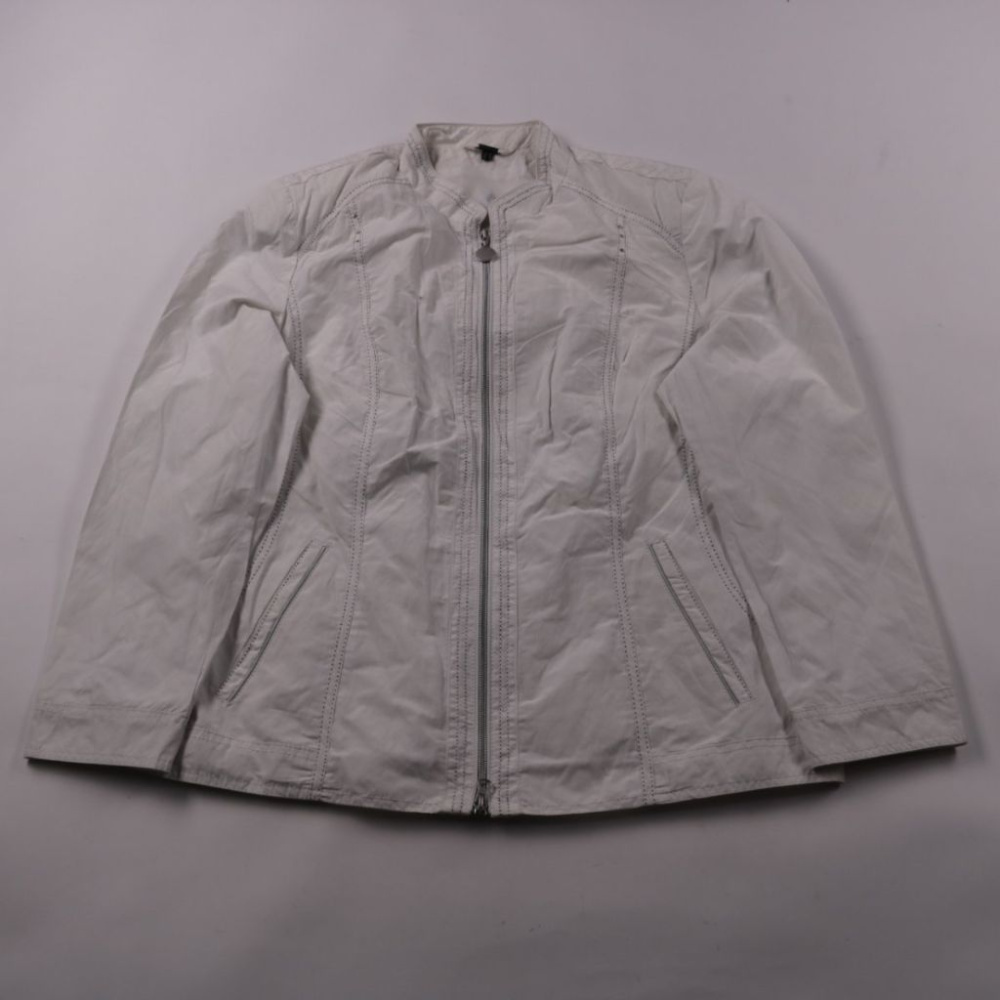 Женская светлая куртка не указано на молнии со стойкой и прорезными карманами. Подойдёт для повседневной носки в демисезон и прохладные летние вечера. Лёгкий материал и подкладка делают её удобной для многослойных образов.