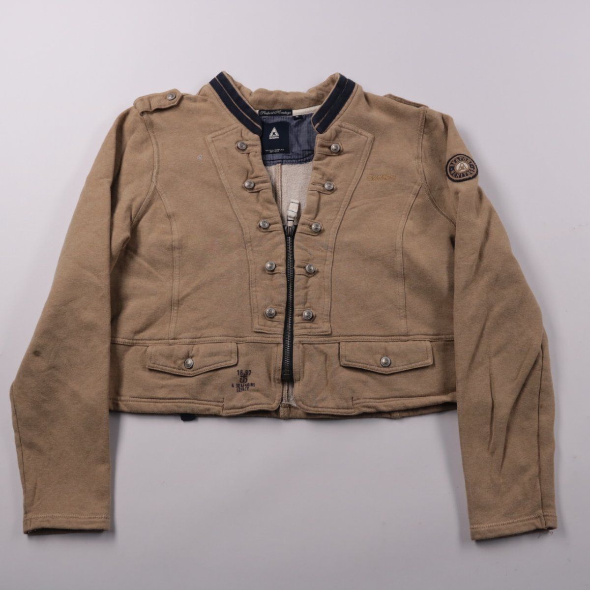 Лёгкая куртка Gaastra Seaport Heritage из плотного хлопка с добавлением эластана, в бежевом цвете, с декоративными пуговицами и молнией. Подойдёт для прогулок и повседневных образов в прохладную весну или осень. Удобные карманы и эластичность ткани дают комфорт в носке и движении.