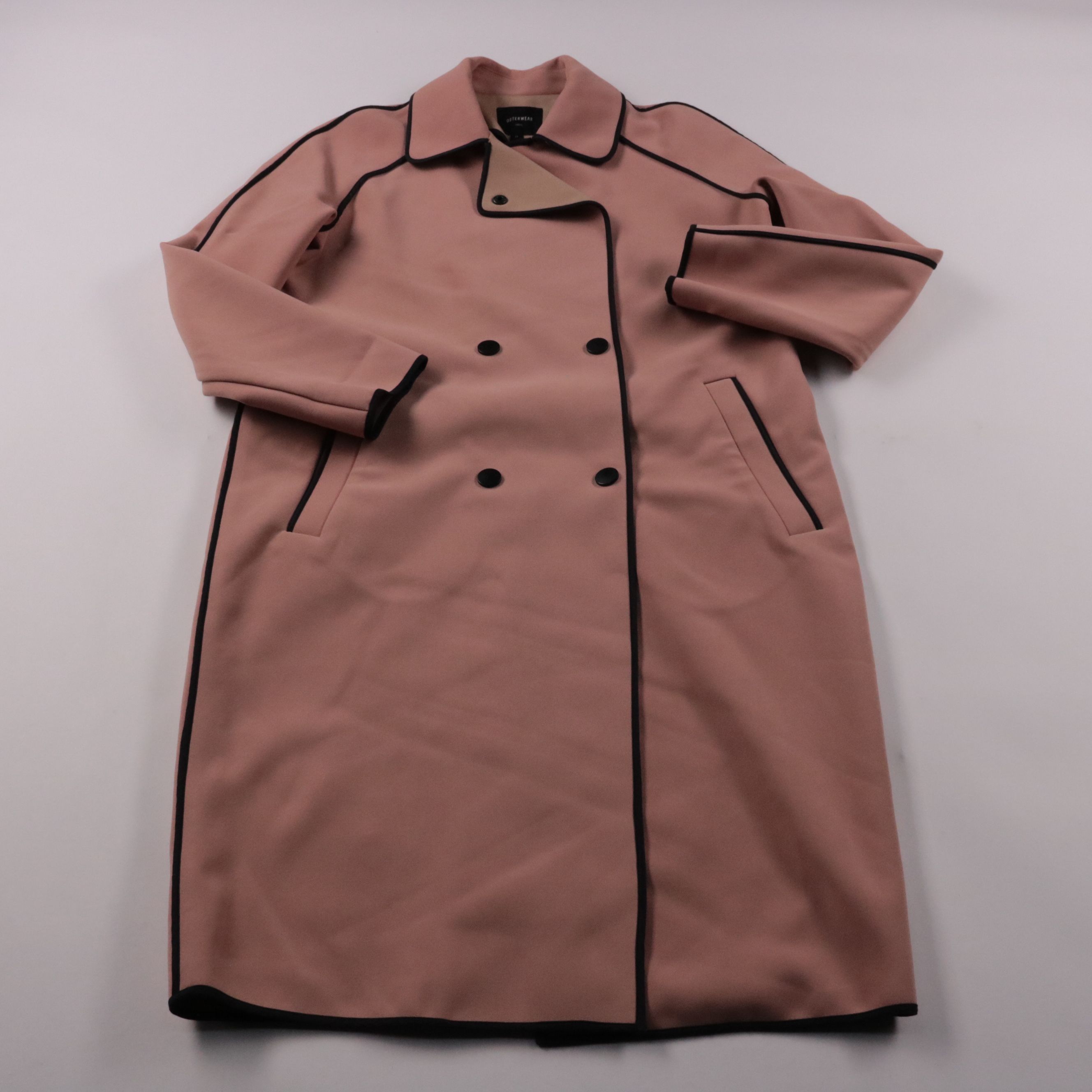 Женское демисезонное пальто Next в пудрово-розовом цвете с контрастной чёрной окантовкой и двубортной застёжкой. Подойдёт для города и офиса в прохладную погоду, легко сочетается с базовыми вещами и обувью. Практичный материал с добавлением эластана де...