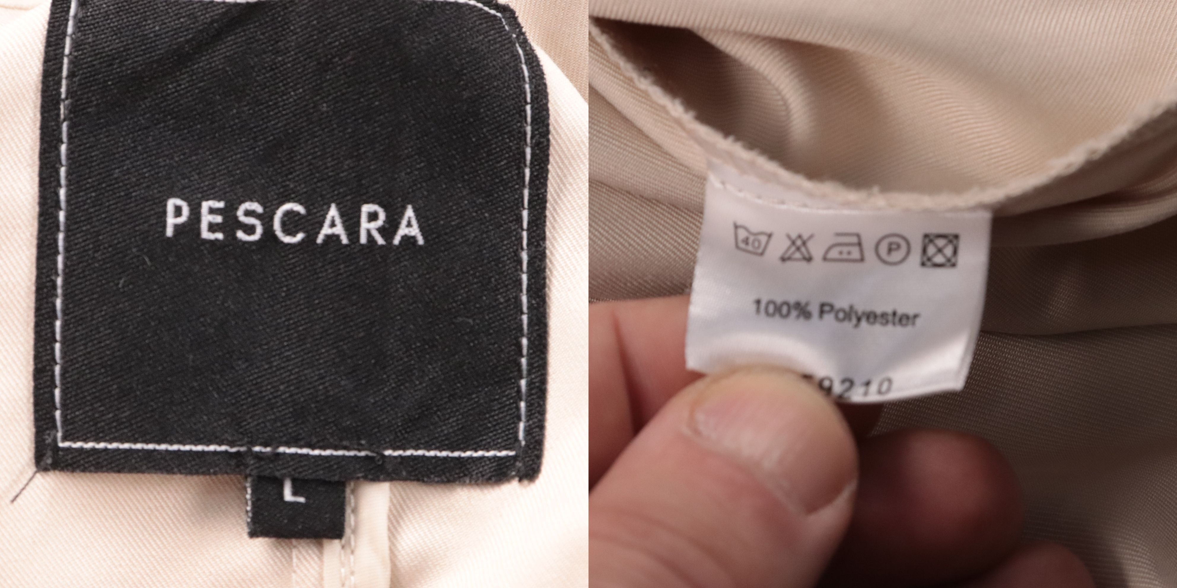 Женский двубортный плащ Pescara бежевого цвета с поясом и высокой стойкой воротника. Подойдёт для весны и осени, хорошо смотрится с джинсами, платьями и офисными комплектами. Практичный материал из полиэстера легко стирается и быстро сохнет.