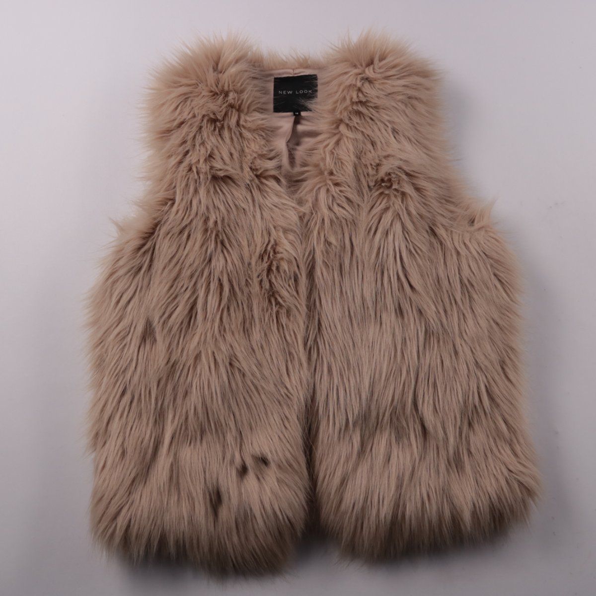 Меховой жилет New Look бежевого оттенка с длинным ворсом и без рукавов. Подойдёт для многослойных образов в прохладную погоду поверх свитера или худи. Практичное преимущество — тёплый объёмный материал добавляет утепление без стеснения движений.