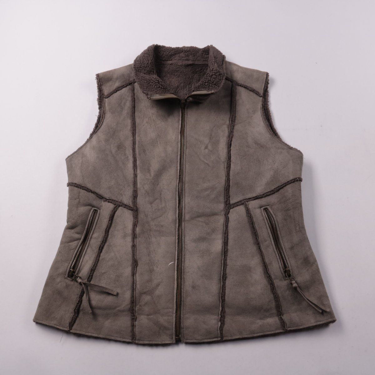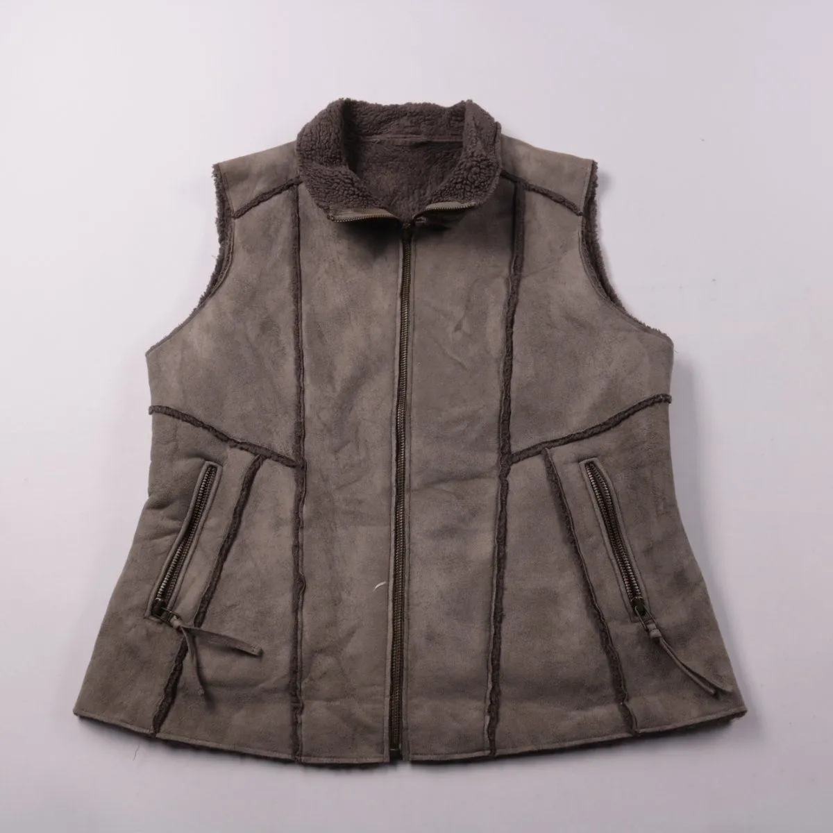 Женский жилет без бренда, серого цвета, с подкладкой из ворса и высоким воротником. Подойдёт для прохладной погоды поверх водолазки или свитера. Удобен за счёт застёжки-молнии и карманов на молнии.