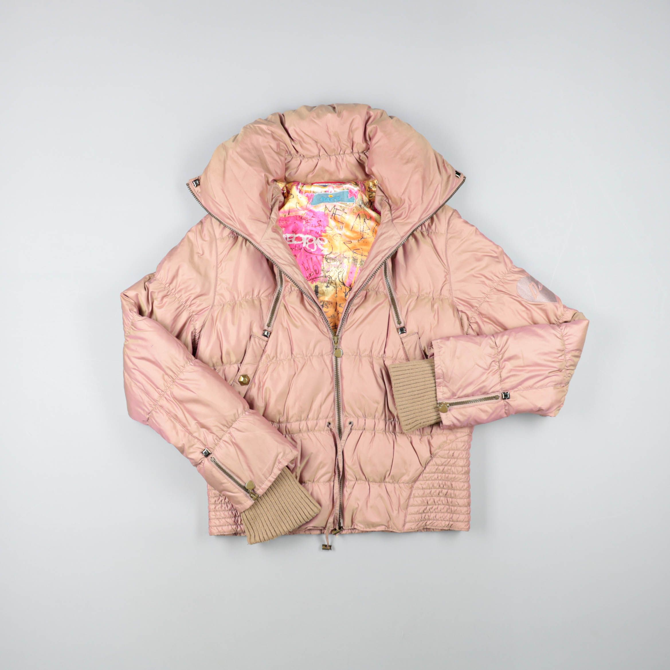 Женский пуховик в нежно-розовом цвете с объёмным воротником и яркой подкладкой. Подойдёт для зимних прогулок и повседневных образов, хорошо защищает от ветра за счёт высокой горловины и трикотажных манжет.