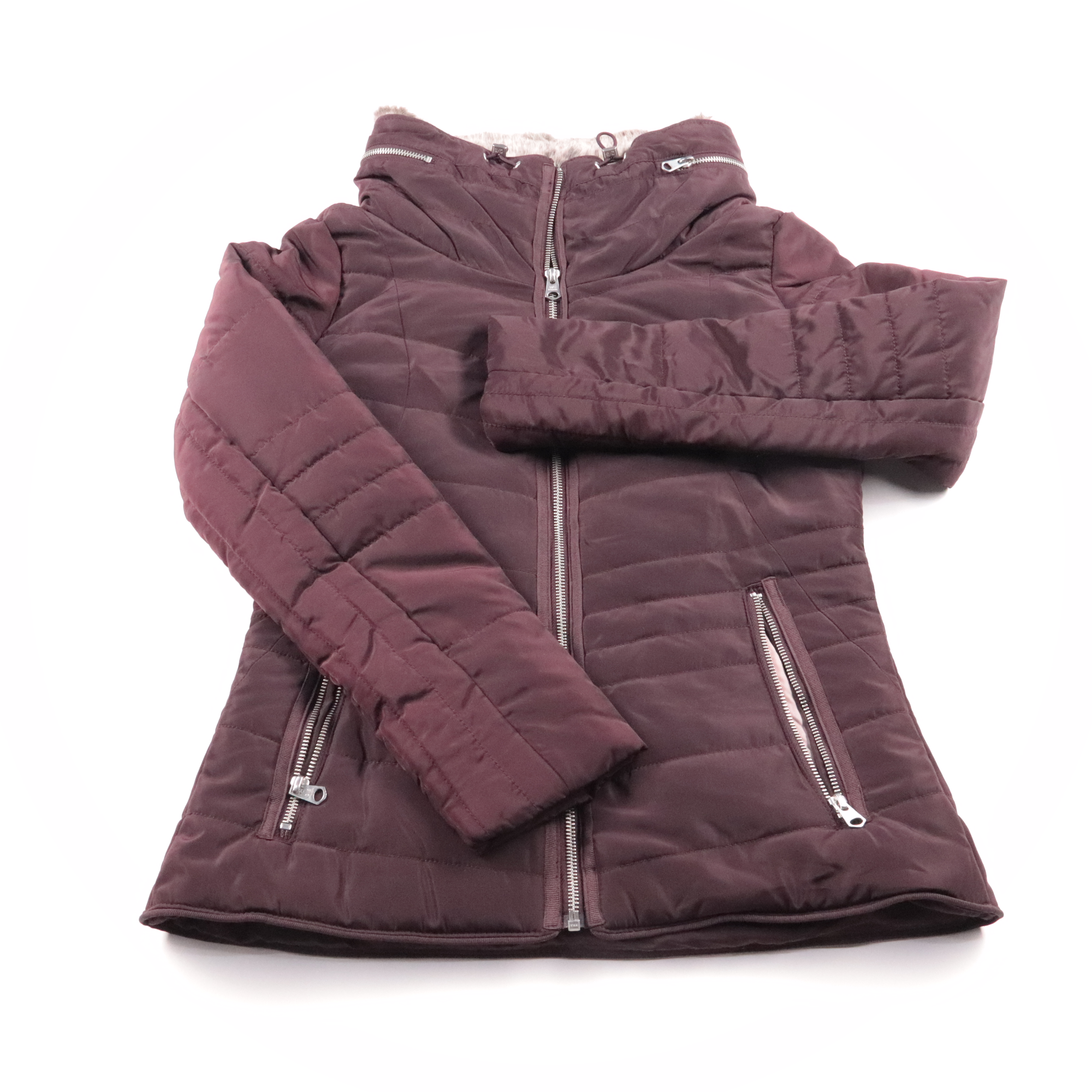 Стёганая куртка Q/S в бордовом цвете, приталенная, с высоким воротником и молниями на карманах. Подойдёт для повседневных прогулок и города в прохладную погоду. Практичный плюс — удобная застёжка на молнии и карманы на молнии для мелочей.