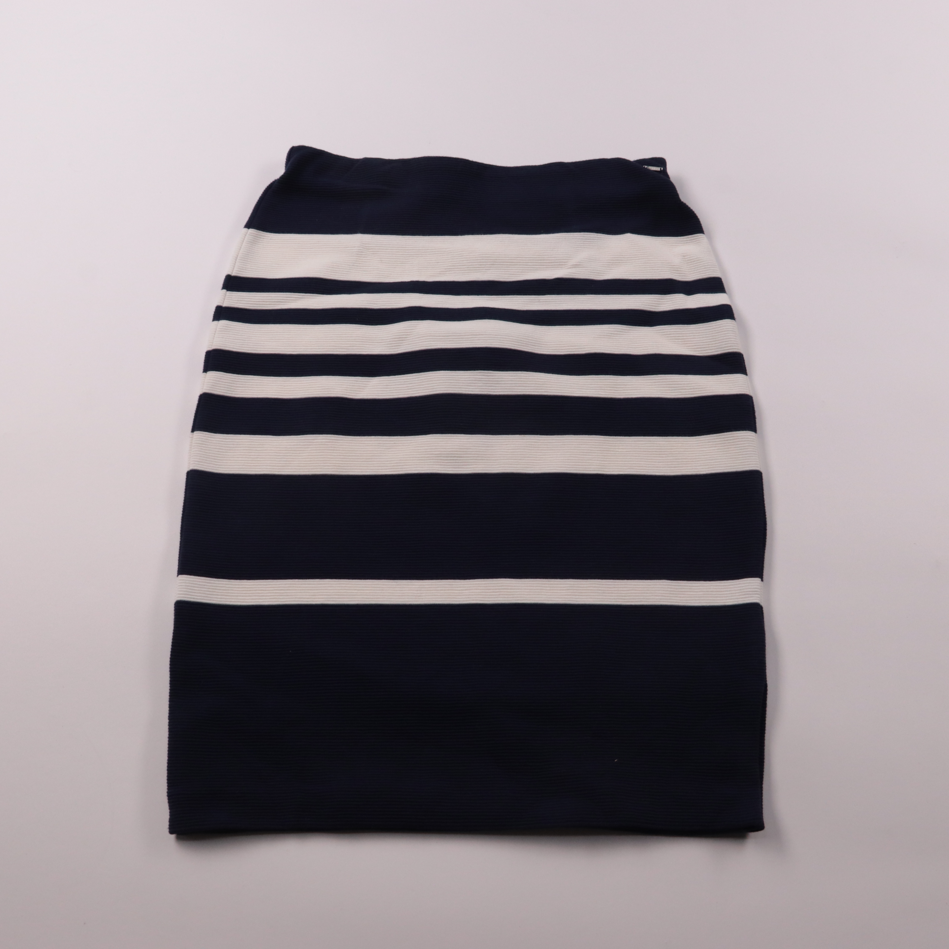 Юбка McGregor в темно-синюю и белую полоску, облегающего силуэта. Подойдет для повседневных образов и офиса с рубашкой или джемпером. Плотный трикотаж с эластаном держит форму и немного тянется.