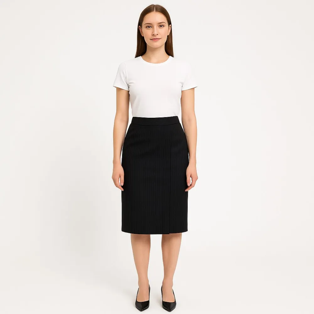 Юбка-карандаш Orsay в чёрном цвете с тонкой вертикальной фактурой/полоской, длина миди. Подойдёт для офиса и повседневных образов с блузой или базовой футболкой. Практична в носке: легко сочетается с разной обувью и верхом.