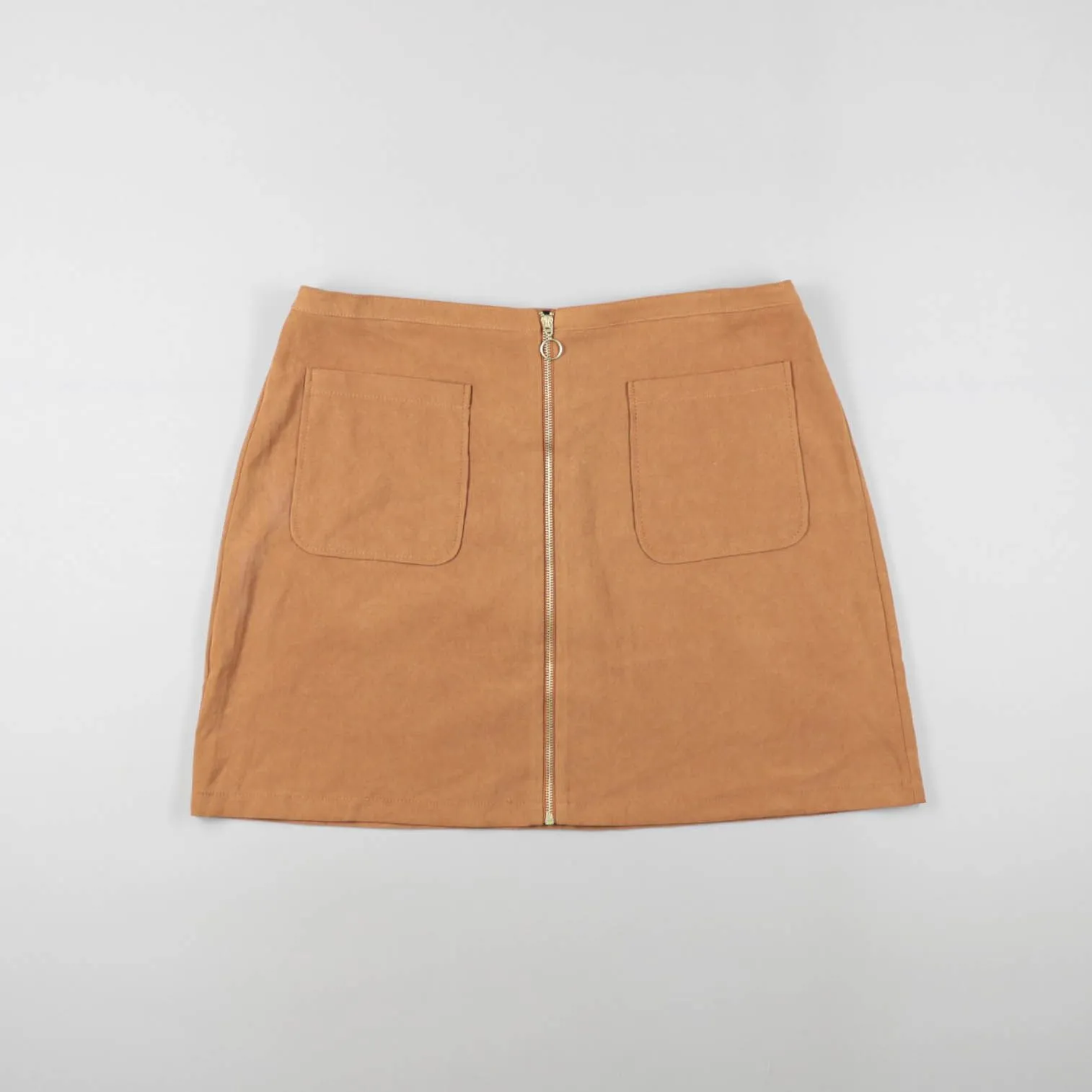 Юбка мини из материала под замшу в тёплом коричневом оттенке, с крупными накладными карманами и центральной молнией спереди. Подойдёт для повседневных образов с свитером, рубашкой или футболкой в прохладную погоду. Молния спереди позволяет удобно надев...