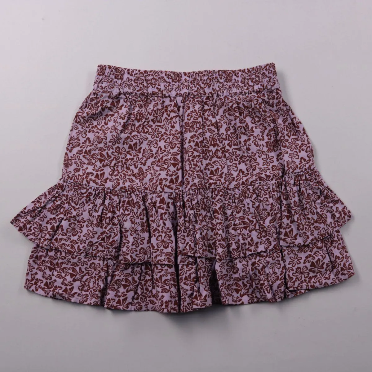 Лёгкая летняя юбка с цветочным принтом и многоярусными оборками на эластичном поясе. Подойдёт для повседневных прогулок и отдыха в тёплую погоду. Вискоза хорошо дышит и быстро сохнет после стирки.