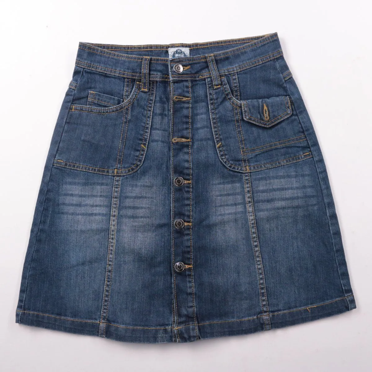 Джинсовая юбка Image синего цвета с застёжкой на пуговицы спереди и накладными карманами. Подойдёт для повседневных летних образов с футболками и рубашками. За счёт добавления эластана ткань немного тянется и комфортно садится по фигуре.