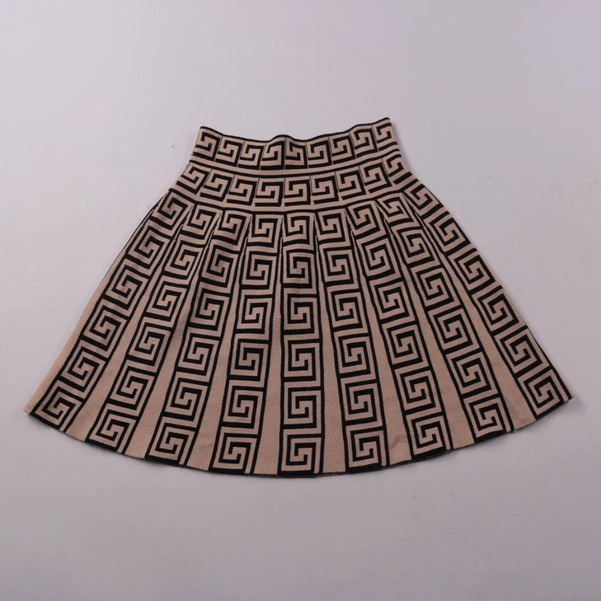 Юбка Quiz расклешённого силуэта с плиссировкой и геометрическим узором в бежево-чёрной гамме. Подойдёт для повседневных образов и на выход, хорошо сочетается с однотонным верхом. Трикотажная ткань комфортна в носке и держит форму.