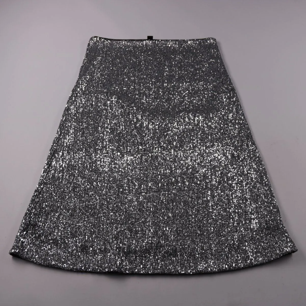 Юбка Monki А-силуэта из блестящей ткани с пайетками/металлизированной нитью. Подойдёт для вечеринок и праздничных образов, хорошо смотрится с базовым верхом. Ткань тянется и эффектно переливается при движении.